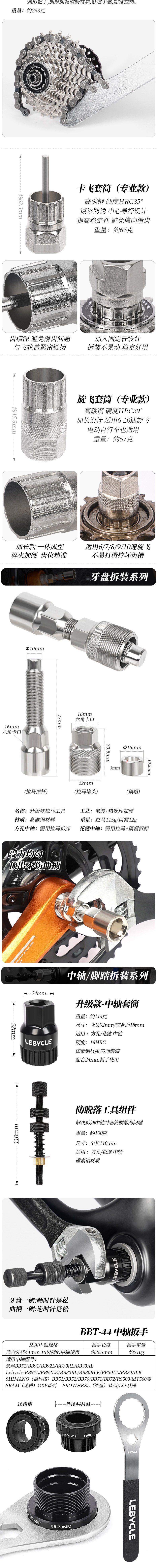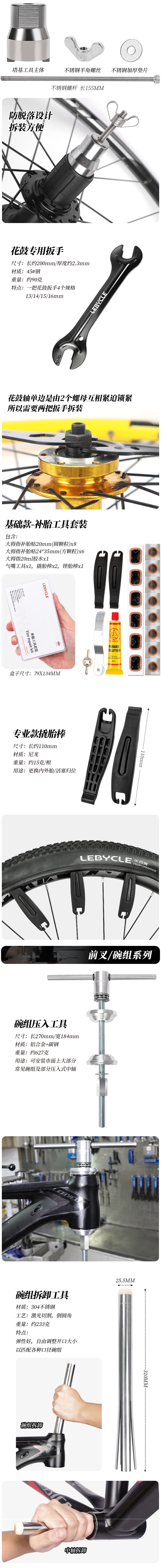 タイヤレバー3本,拡張スピンスリーブ(アップグレード版),ソケット+フライホイールレンチ(プロモデル),プーラー+トップキャップ(バージョンアップ版),プロフェッショナルボトムブラケットスリーブ,プロフェッショナルボトムブラケットスリーブ+落下防止ツール,一体型ボトムブラケットレンチ-BB44,プロフェッショナルフットレンチ,ライダーススタイルチェーンカッター+フック,マジックバックルクイックリリースプライヤー,基本的なタイヤ修理ツールセット,ヘッドセット/圧入ボトムブラケット圧入ツール,フラワーコア打ち込みツール,ワイヤーカッター(プロ仕様),T25トルクスドライバー+ギャップ調整ピース,オイル注入ツール,9-in-1 六角レンチセット,モンキーレンチ1本