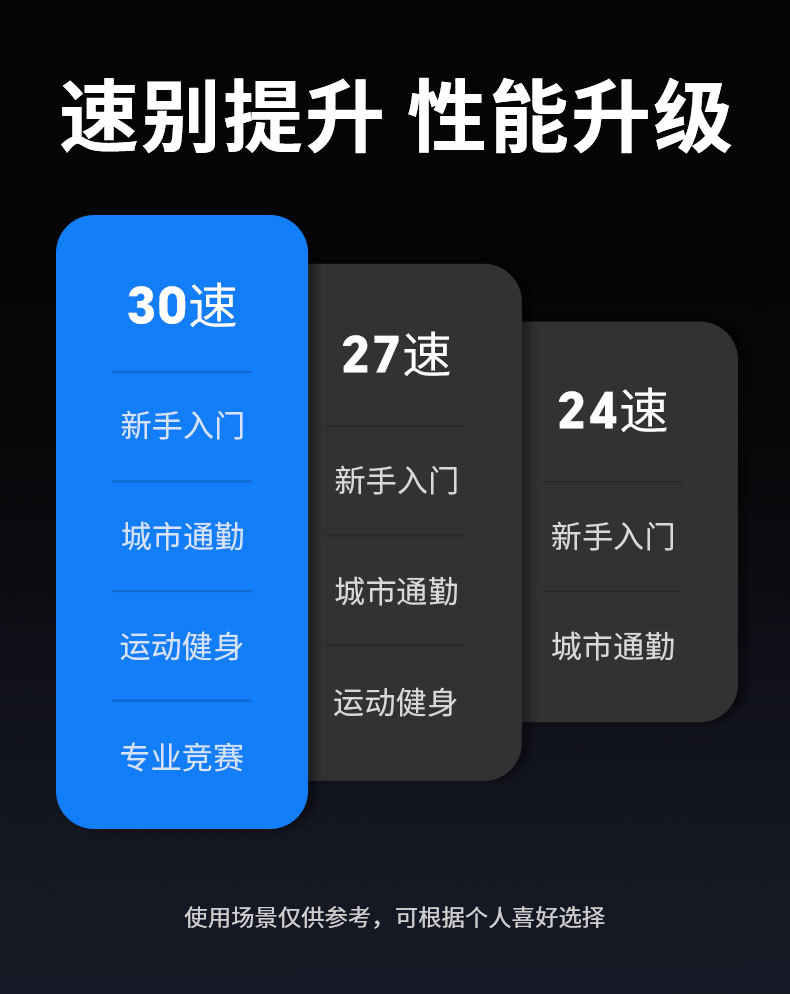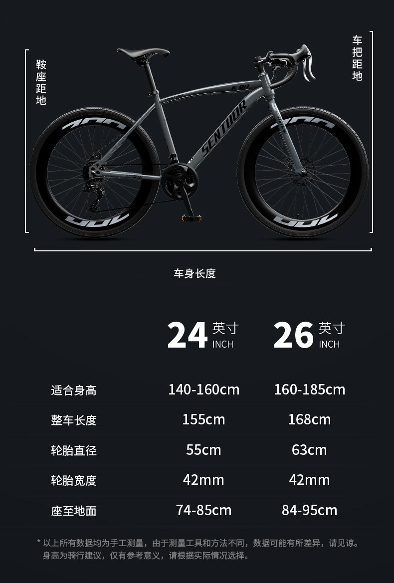 尺寸 24英寸【建议身高140-160CM】-24速,26英寸【建议身高160-185CM】-24速,24英寸【建议身高140-160CM】-27速,26英寸【建议身高160-185CM】-27速,24英寸【建议身高140-160CM】-30速,26英寸【建议身高160-185CM】-30速