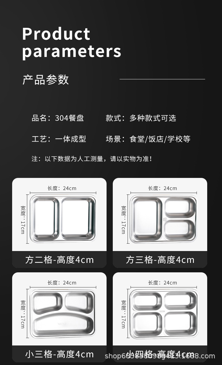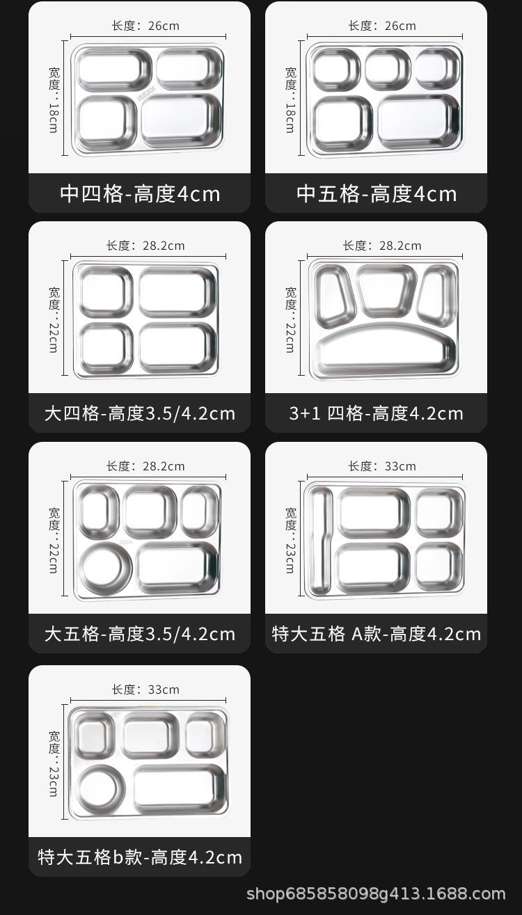 颜色 深大四格(28*22*4.2cm),深大五格(28*22*4.2cm),新款欧式四格餐盘(26*18.5*4cm),新款欧式五格餐盘(26*18.5*4cm),新款欧式3+1餐盘(26*18.5*4cm),浅大四格(28*22*3.5cm),浅大五格(28*22*3.5cm),小四格(24*17*4.2cm),小三格(24*17*4.2cm),新方二格(24*17*4.2cm),新方三格(24*17*4.2cm),中四格(26*18*4cm),中五格(26*18*4cm),3+1四格(28*22*4.2cm),特大五格A款(33*23*4.5cm),特大五格b款(33*23*4.5cm),特大六格(33*23*4.5cm)