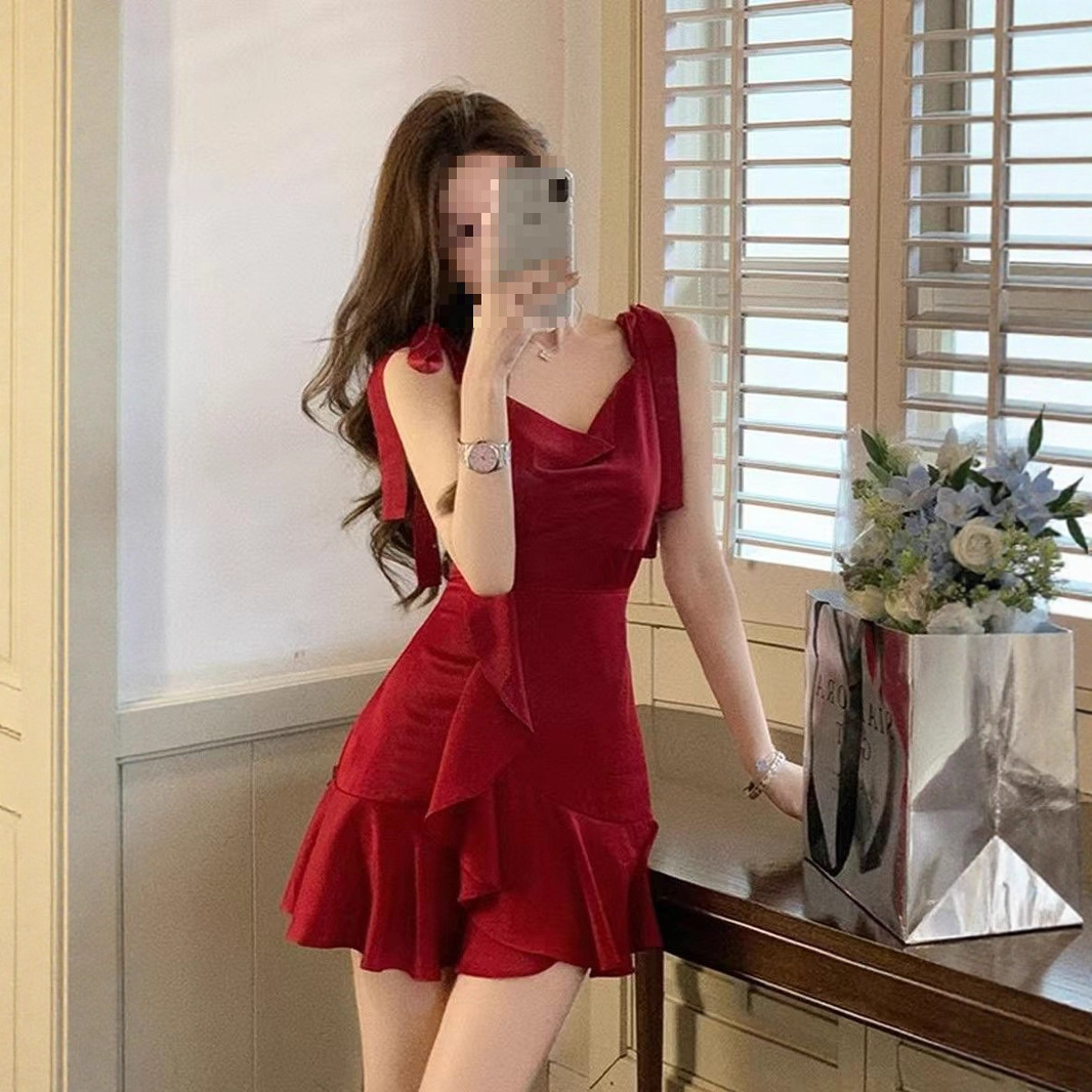 フレンチレトロヘップバーンスタイルセレブレッドサスペンダードレスレディースサマーウエスト痩身フリルスカート
