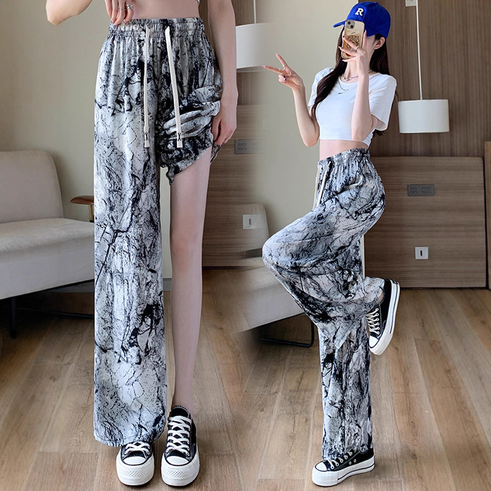 アイスシルクタイダイワイドレッグパンツ女性用夏薄手大きいサイズクール空調パンツハイウエストストレートカジュアルフロアレングスパンツ