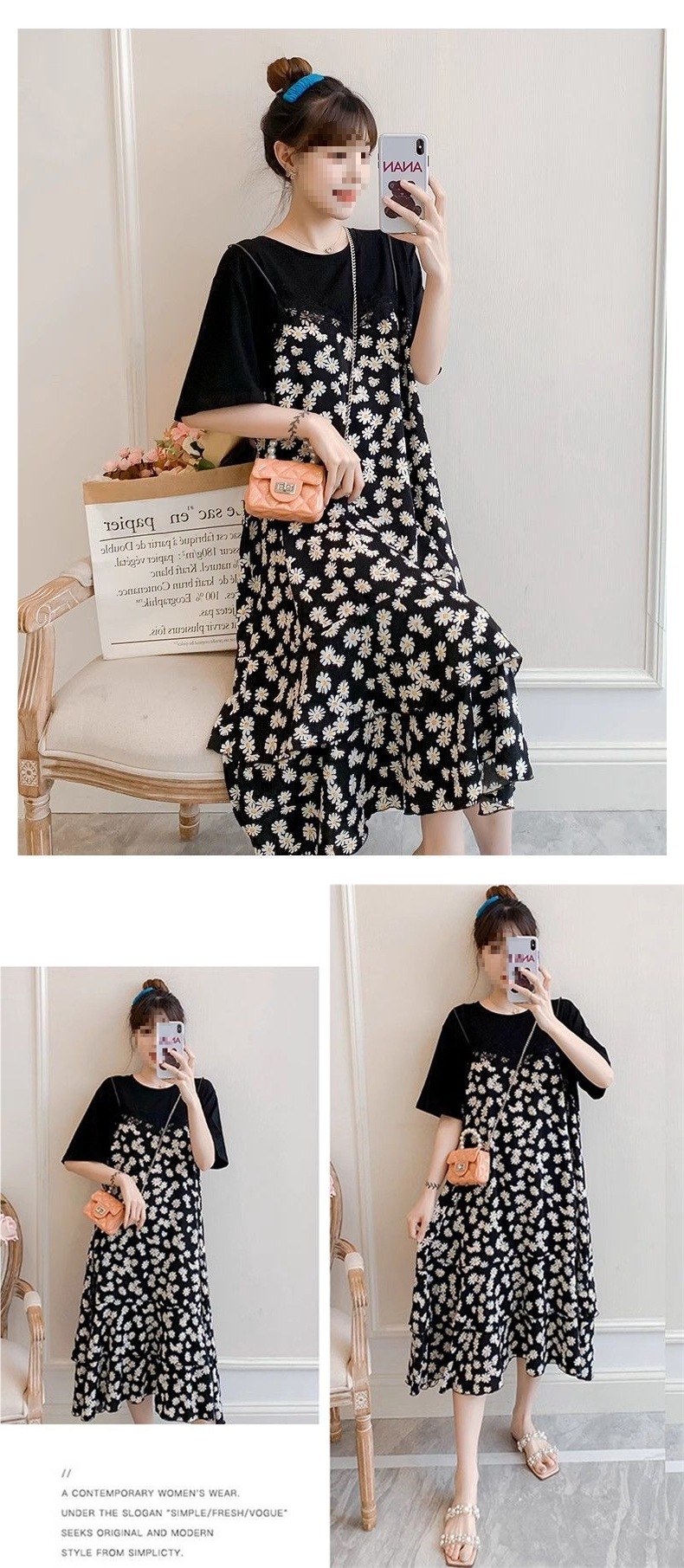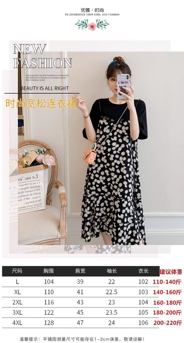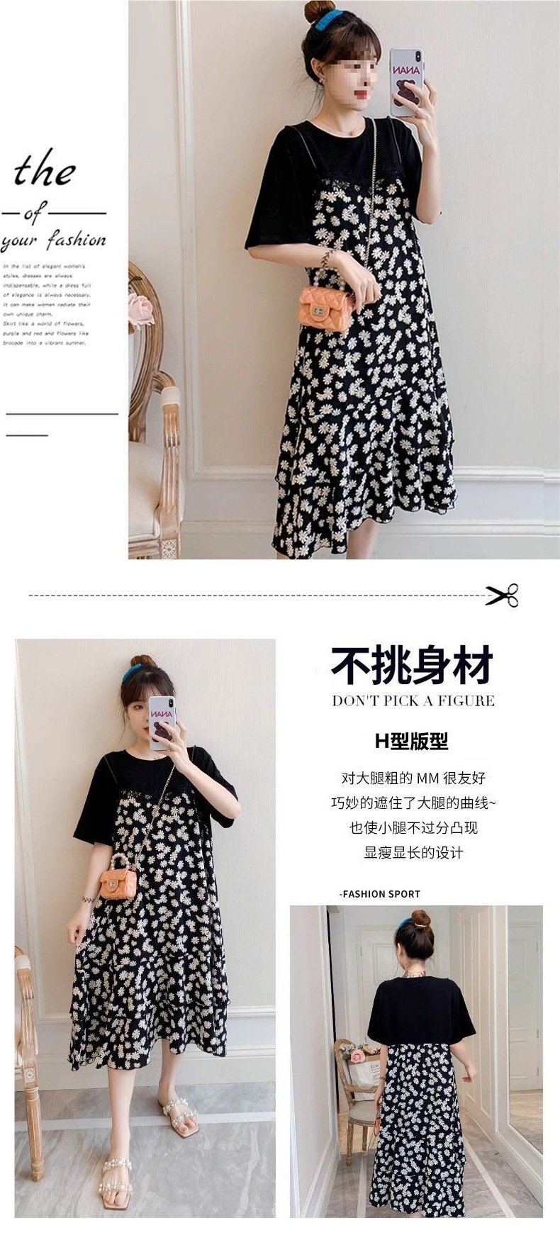 夏の新しいプラスサイズの女性の服ファットmmスリムレーススプライシング花柄シフォンサスペンダードレス偽ツーピースフィッシュテールスカート