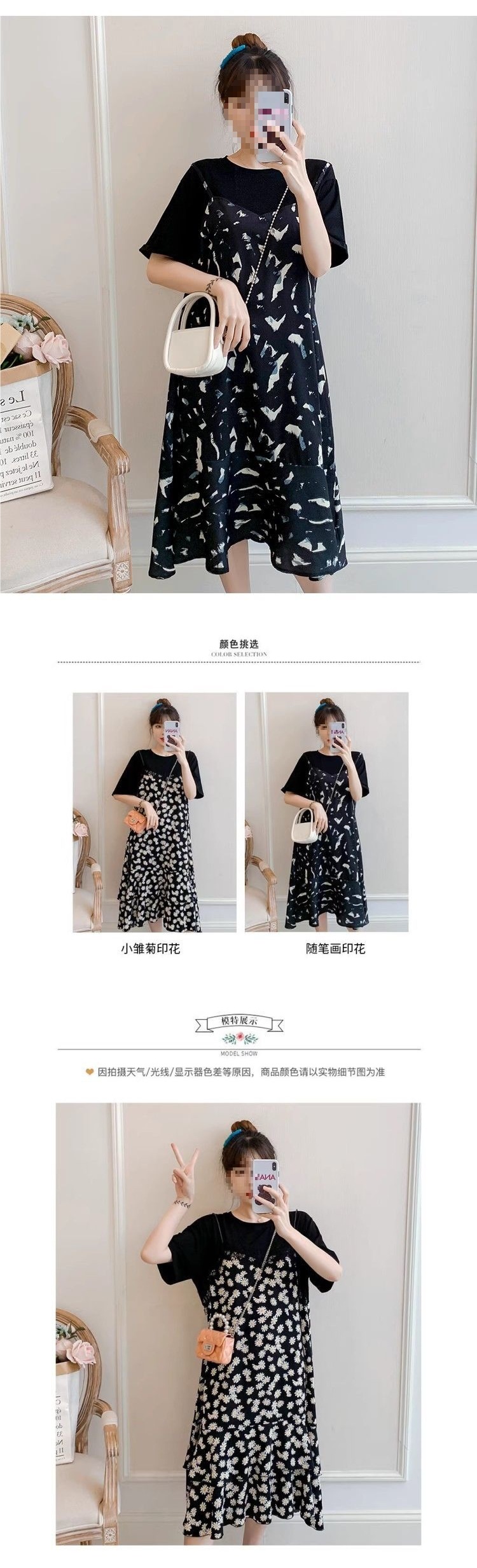 シルクコットンかわいい滑車アヒルプリント半袖Tシャツロングスカートレディース夏ゆったり大きいサイズお腹カバー膝上マタニティドレス