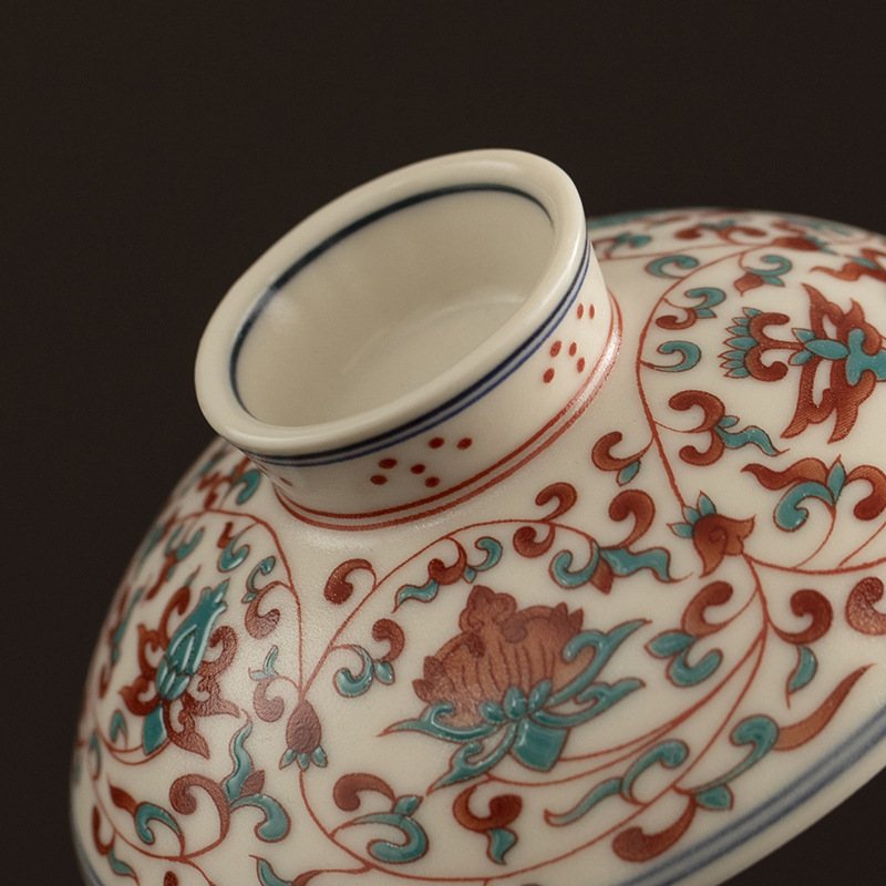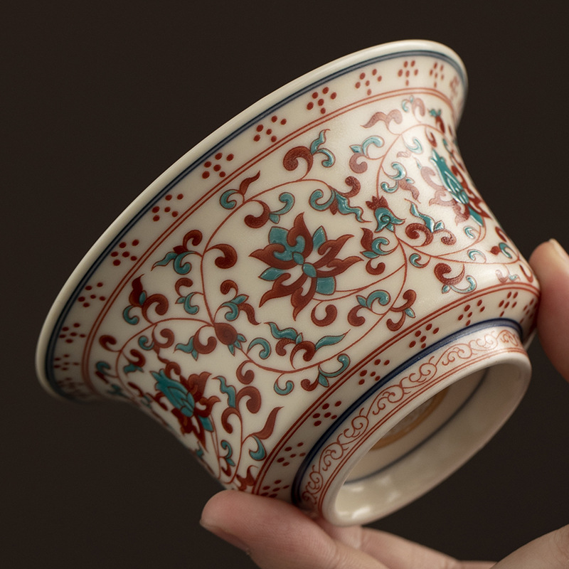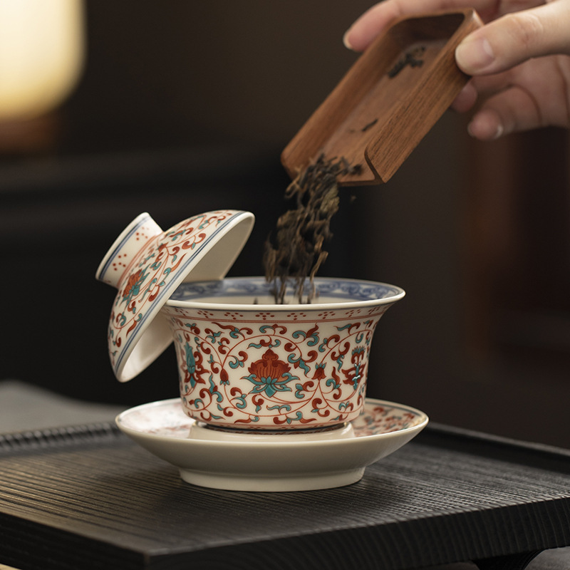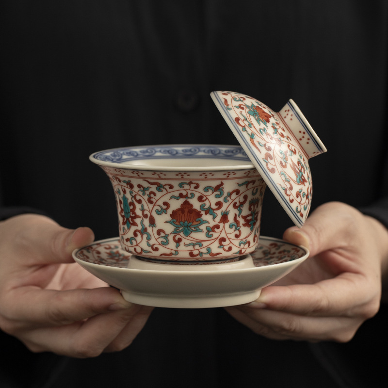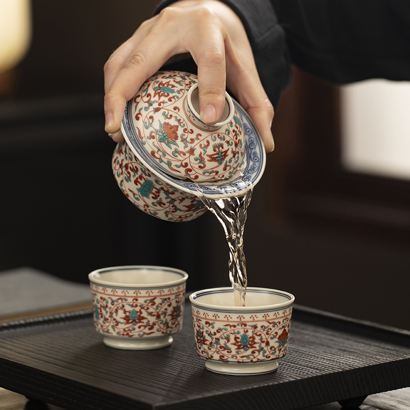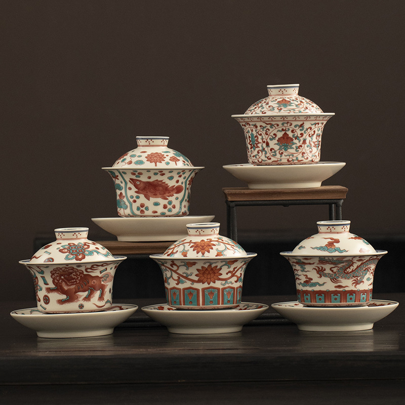 アンティークの赤と緑の蓮の花模様のホバリング三蓋ボウル家庭用セラミックティーボウルハイエンドの火傷防止カンフーティーセット