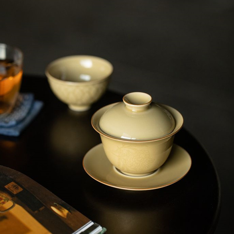 中国式レリーフ三才蓋碗の高級陶磁器の工夫茶器の定窯の復古的なお茶の碗は手を温めません。