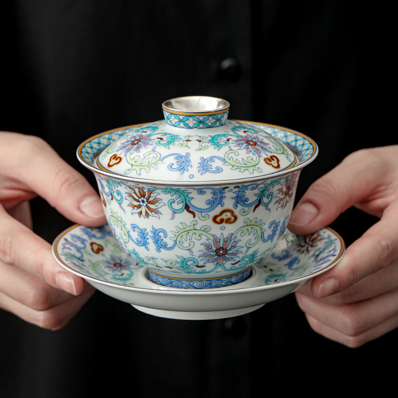 景徳御製エナメル彩銀三才蓋碗陶磁器茶碗茶こし器大茶杯工夫茶器礼箱