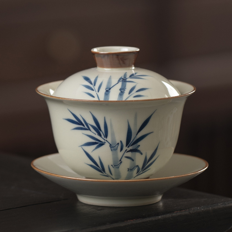 レトロな手描きの三才蓋ボウル大型シングルハイエンド家庭用セラミックティーセットティーカップカンフー釉下色茶ボウル
