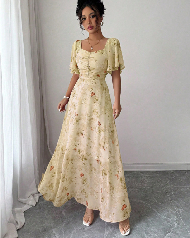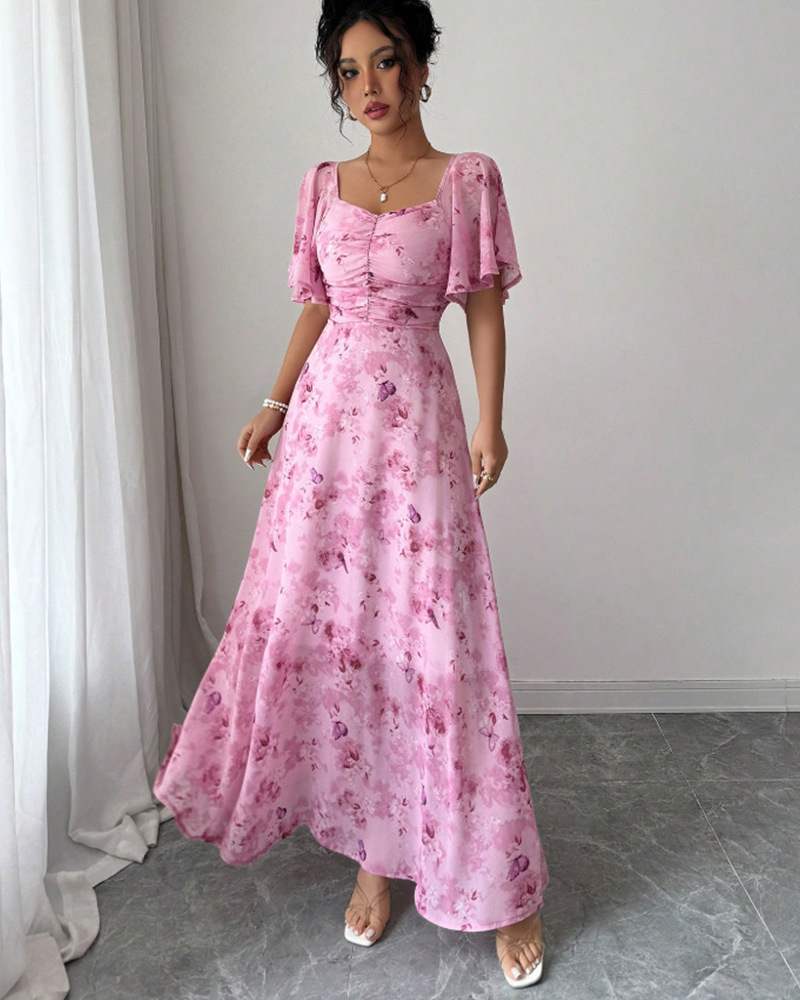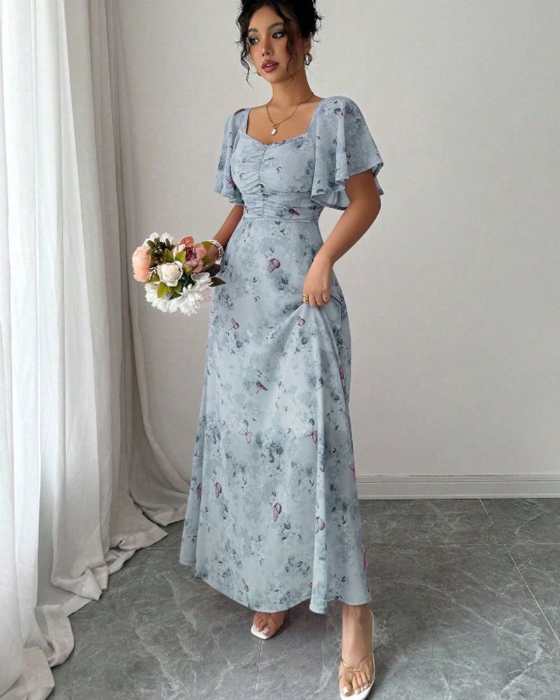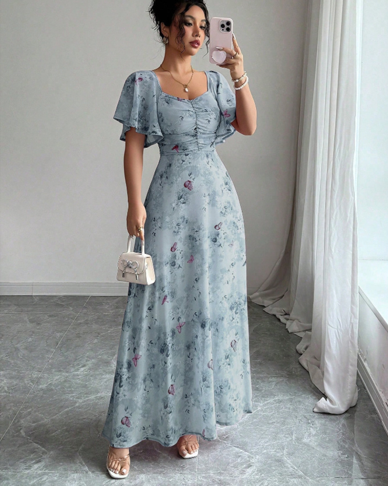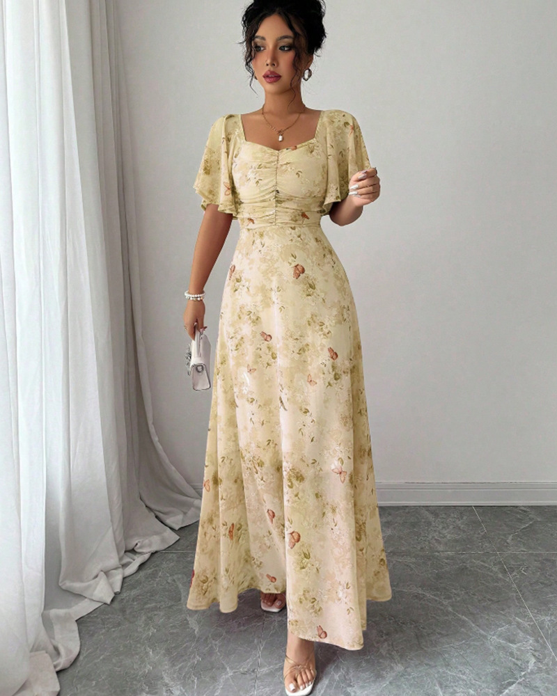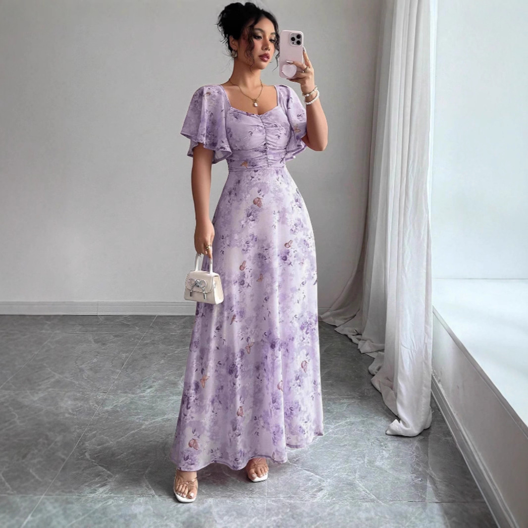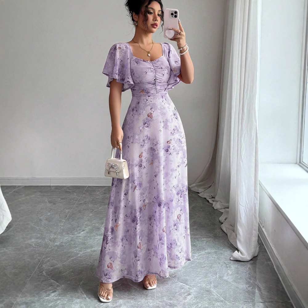 2025年夏の新しいヨーロッパとアメリカのアマゾンクロスボーダー外国貿易フリルスリーブプリントスリムでエレガントなドレスが登場