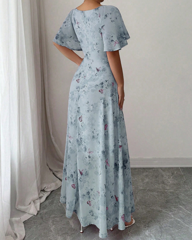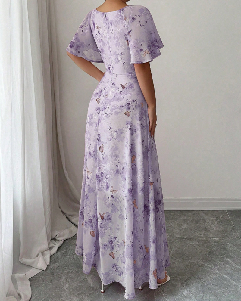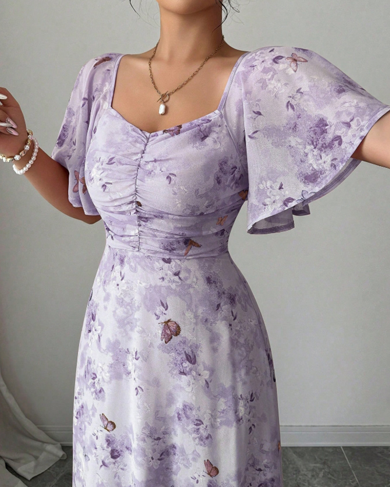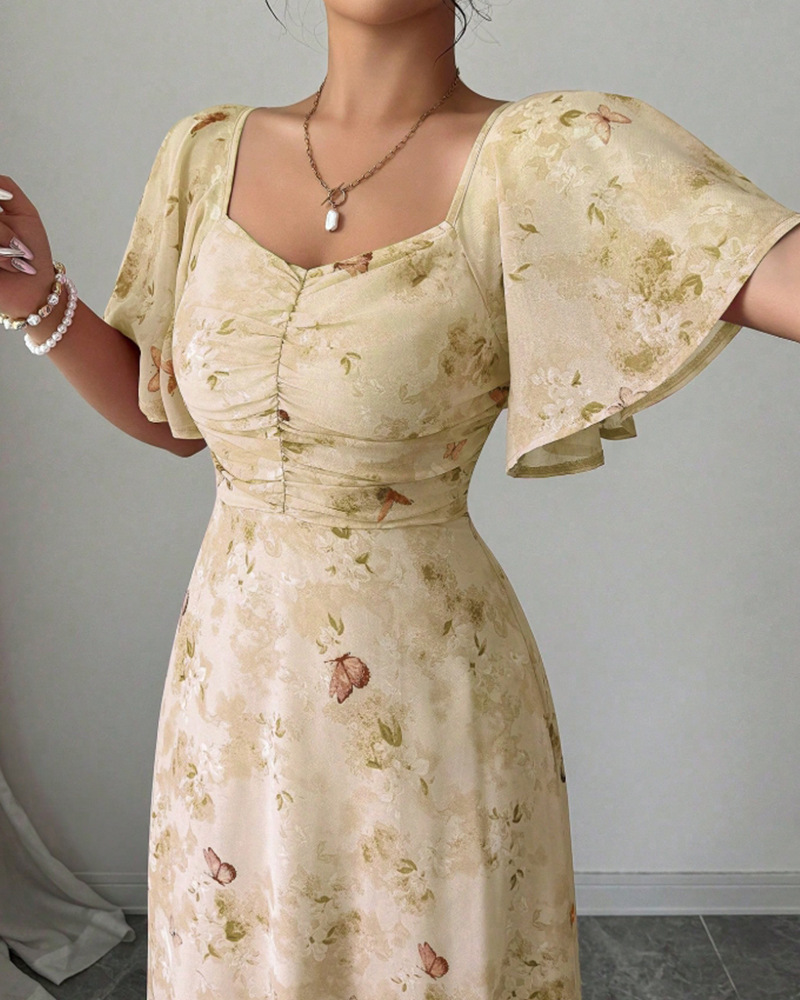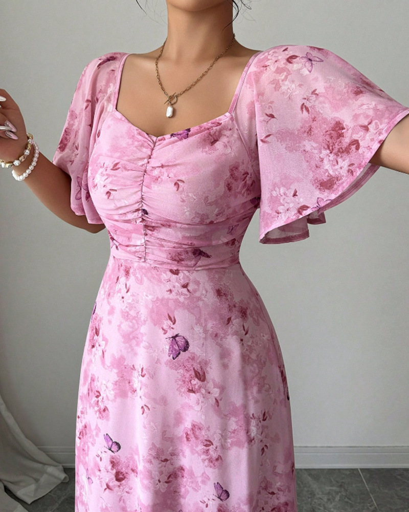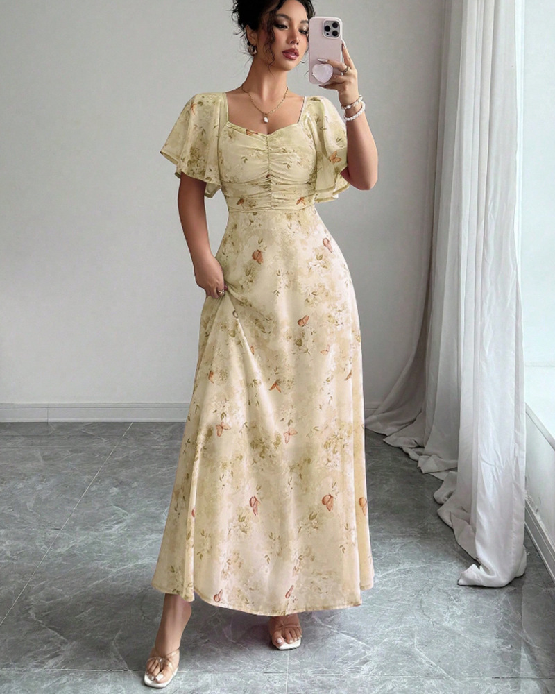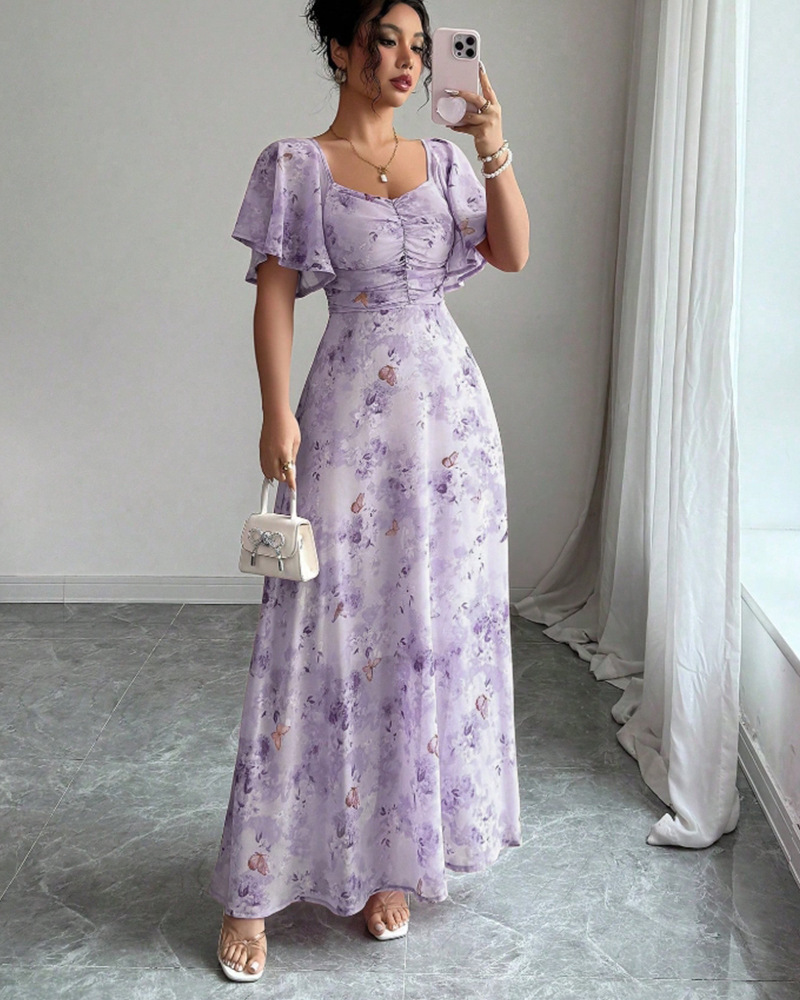 2025年夏の新しいヨーロッパとアメリカのアマゾンクロスボーダー外国貿易フリルスリーブプリントスリムでエレガントなドレスが登場