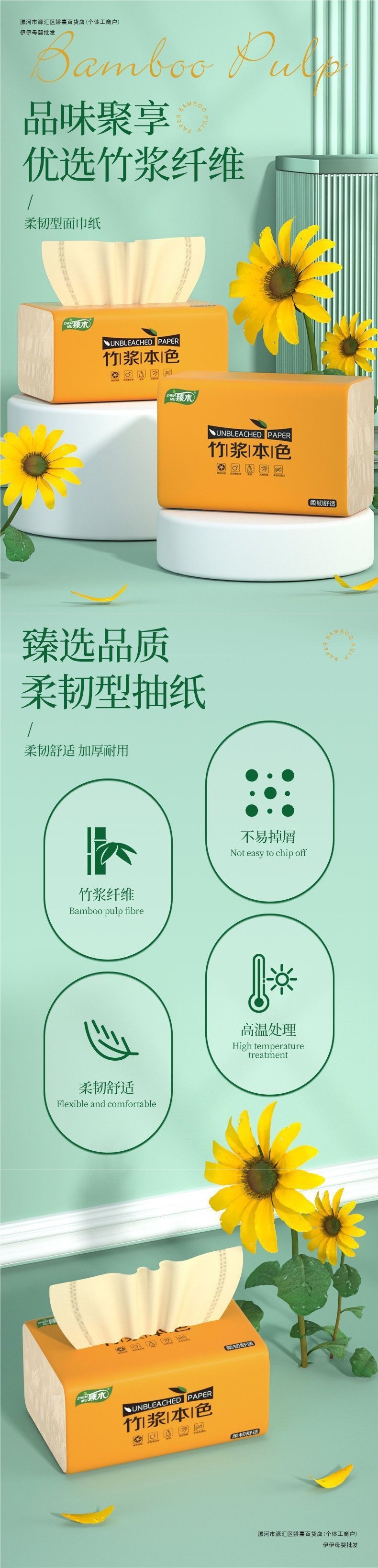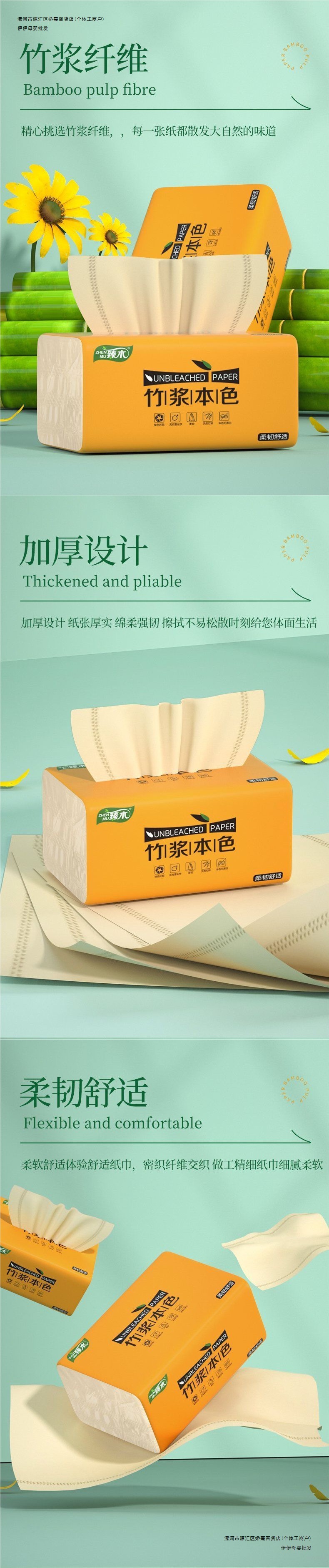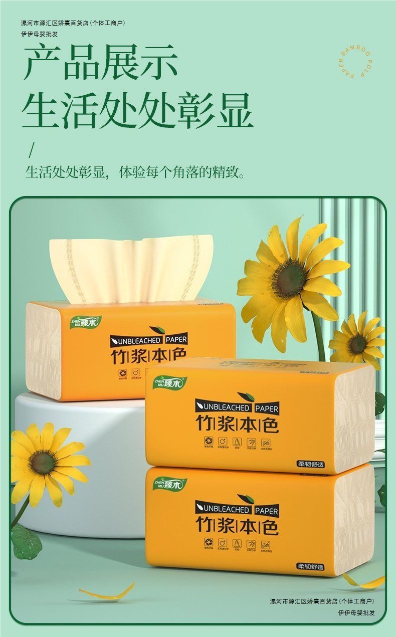 恬羽の大きい包みは紙の箱を引き出して竹のパルプの地色の家庭用ナプキンを卸売りします。