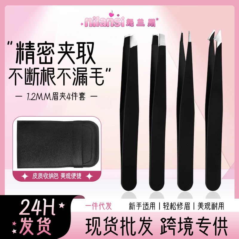 不锈钢黑色眉夹专用修眉夹镊子正斜口拔毛高精密粉色修眉神器套装