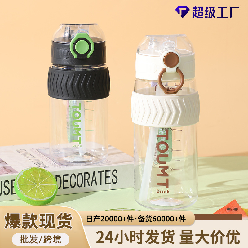 吸管杯带刻度弹跳杯耐热防摔塑料杯学生便携提绳水壶塑料水杯茶杯