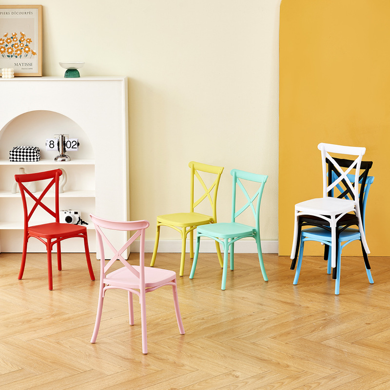 プラスチック製の椅子、家庭用クロスバックウェディングチェア、イベント用屋外ウェディング宴会椅子、リビングルーム用背もたれ付き椅子、ダイニングテーブルチェア