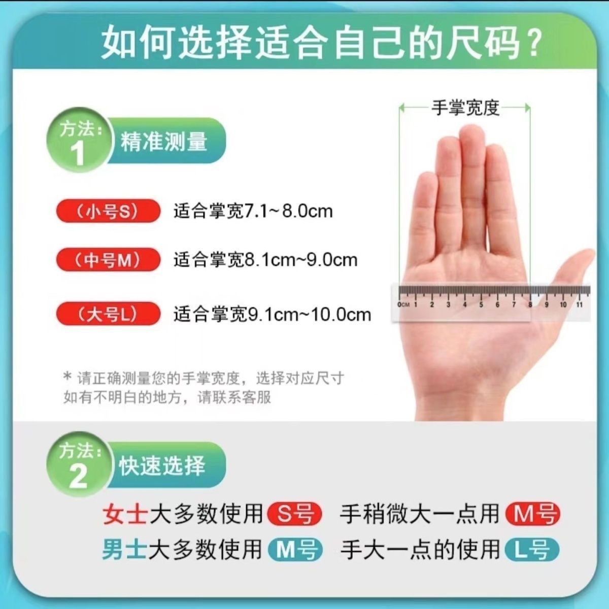 手掌宽度尺码 S:7-8cm;M:8-9cm;L:9-10cm