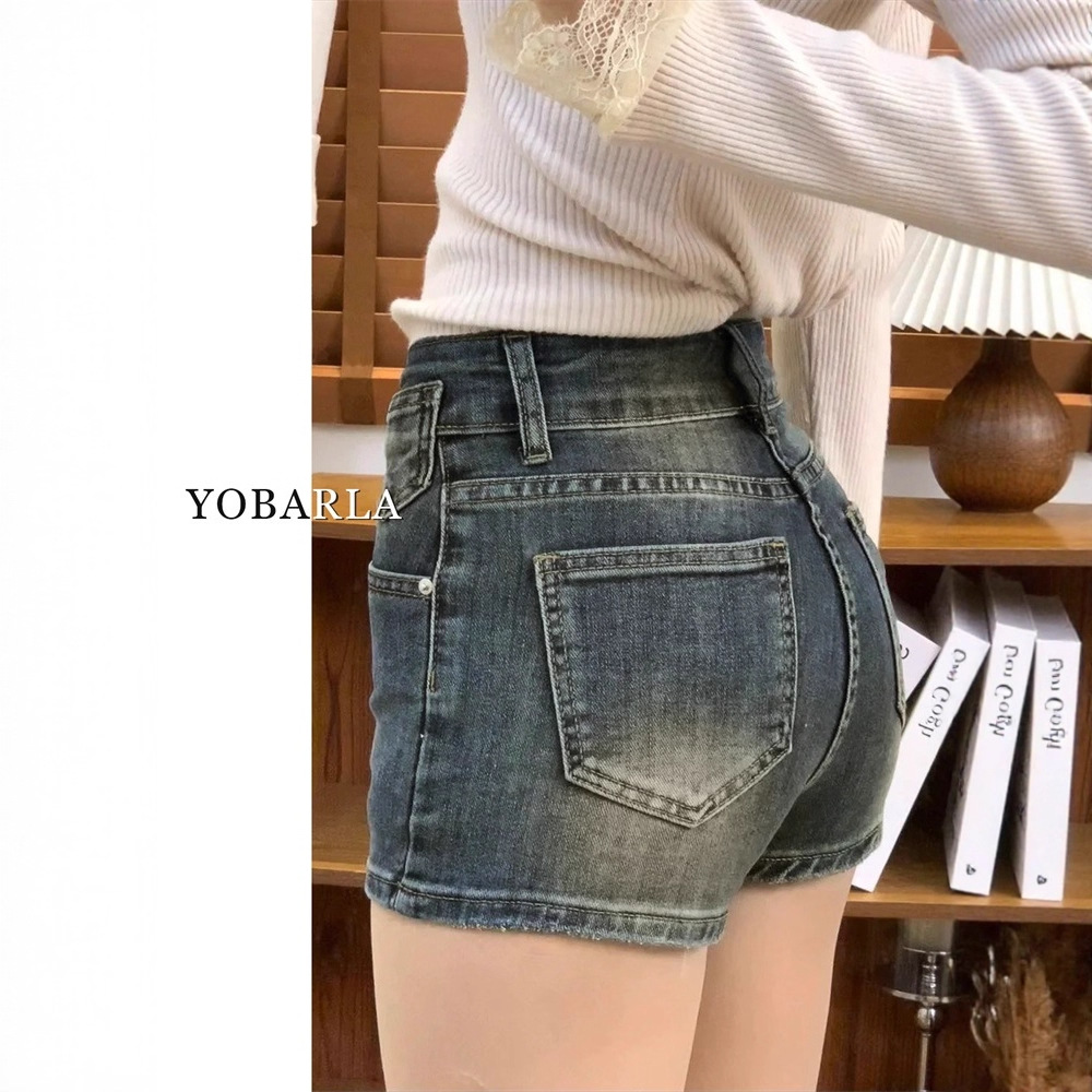 女性のためのハイウエストデニムショートパンツ 2025 夏の新しいホットガールイエローマッドカラーデザインスリム A ラインストレートホットパンツ