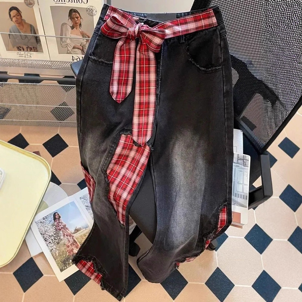 【韩牛】欧美复古蝴蝶结绑带牛仔裤子女辣妹设计感拼接拖地裤