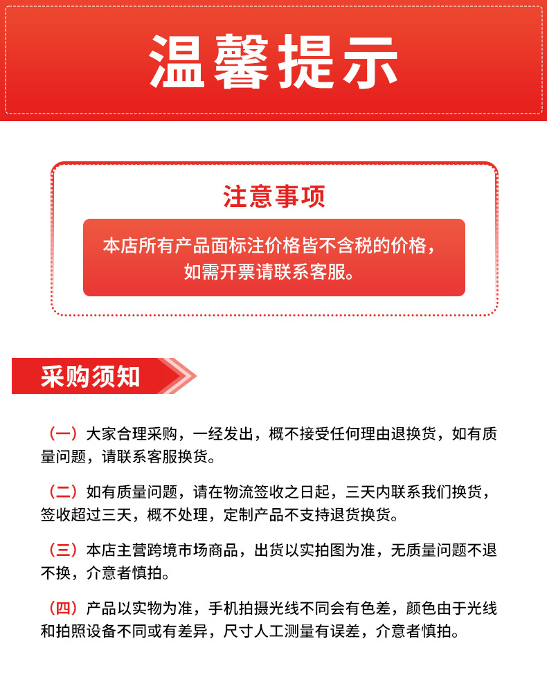 跨境网红产品具有时效性,随时都有可能调价,非产品质量问题,不接受因滞销,平台链接下架等原因退货退款。
