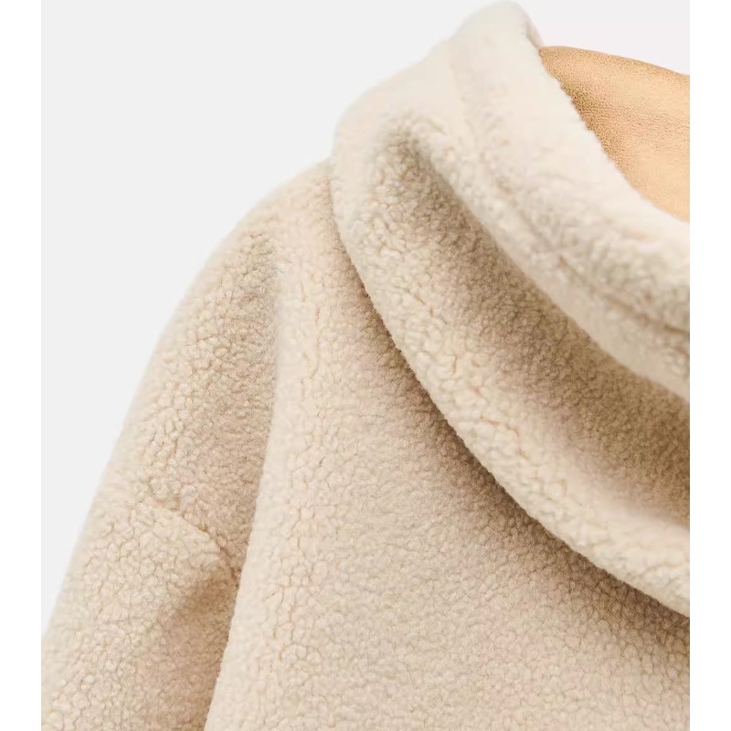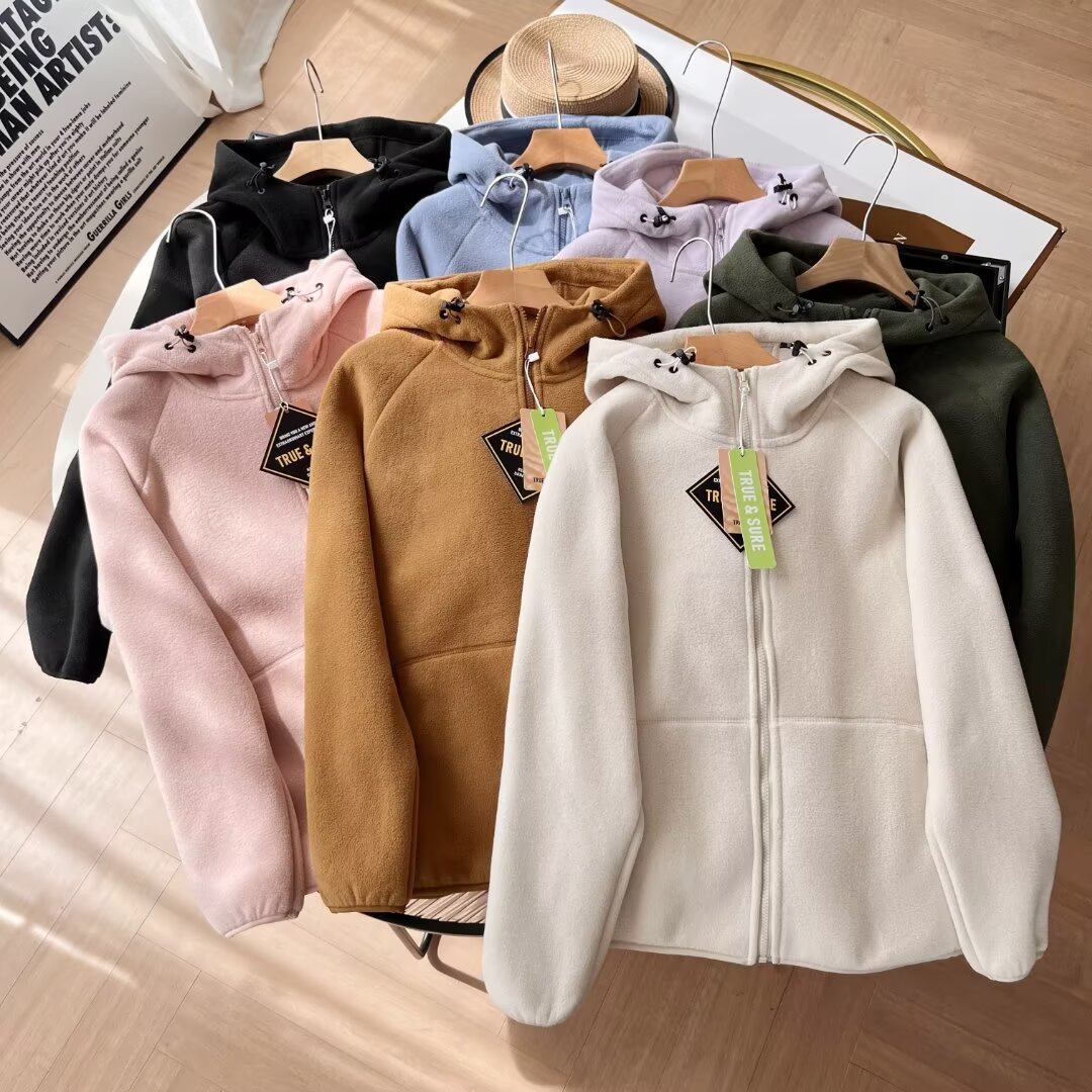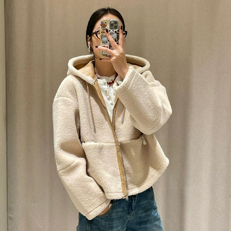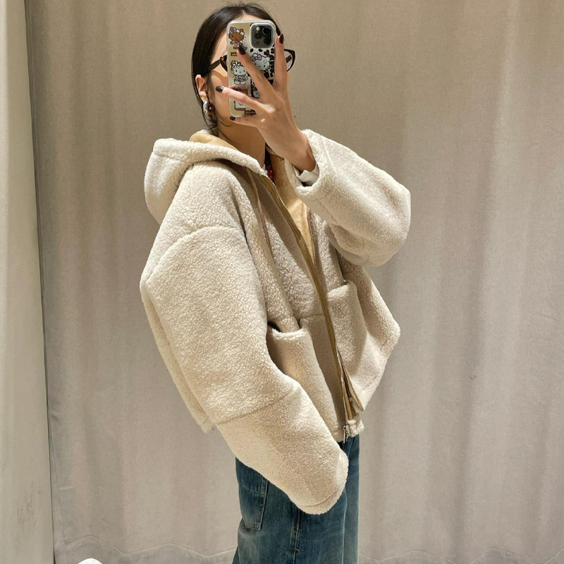日单女装秋冬加厚保暖宽松羊羔毛夹克休闲摇粒绒连帽拉链长袖外套
