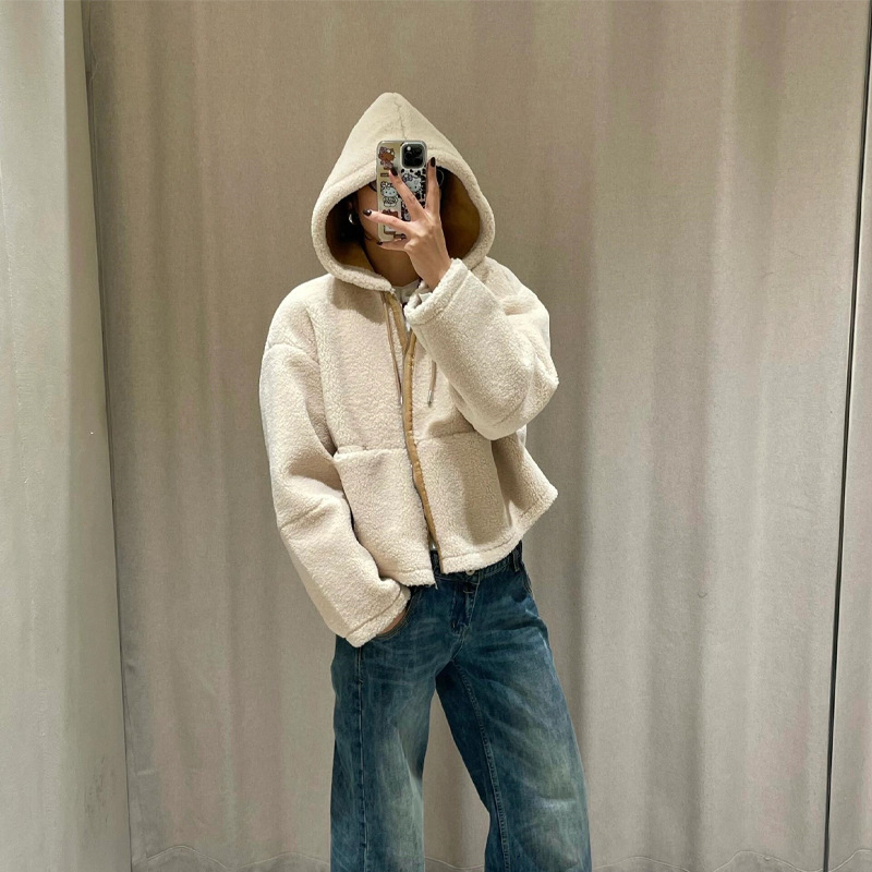 白色超好看厚奶fufu韩系毛茸茸连帽短款羊羔毛毛绒外套女8741235
