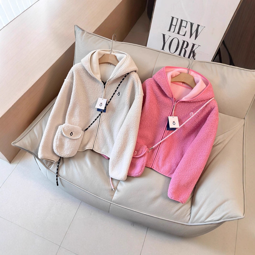 25年秋冬新款学院风轻盈粉色摇粒绒连帽宽松外套女上衣厚