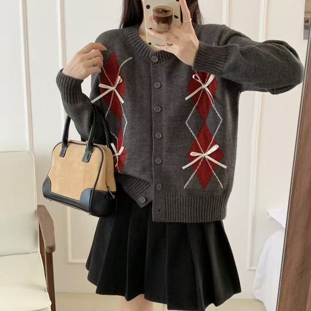 2025春秋冬季新款圆领菱格针织开衫女宽松显瘦百搭毛衣外套上衣