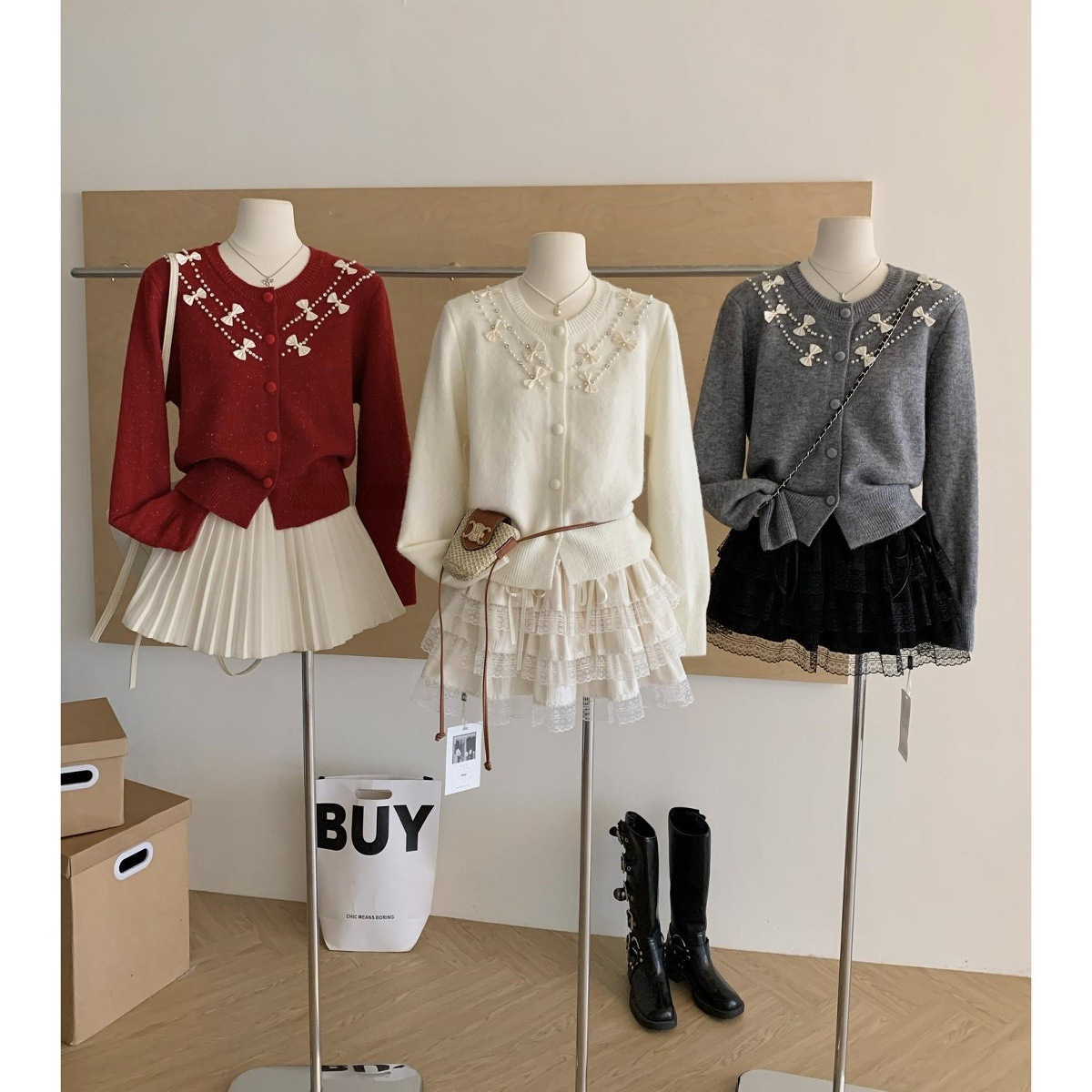 重工钉珠蝴蝶结毛衣韩系慵懒风女秋冬高级感针织开衫外套圣诞上衣