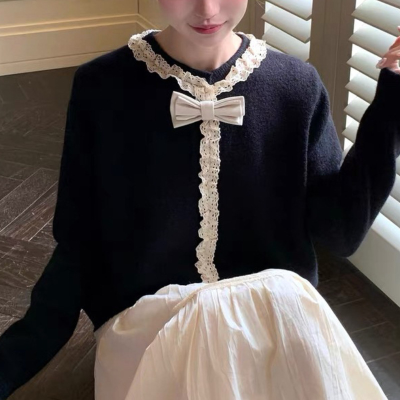 法式甜美蕾丝拼接蝴蝶结长袖针织衫女秋冬洋气高级感减龄毛衣上衣