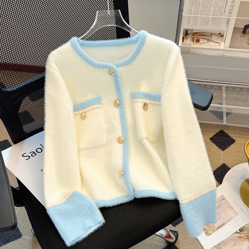 フランス風の小さな香りの風が色のスタンドカラーのセーターのコートの女性の秋冬の新型はミンクの独特なボタンのニットのカーディガンの女性に似せます。