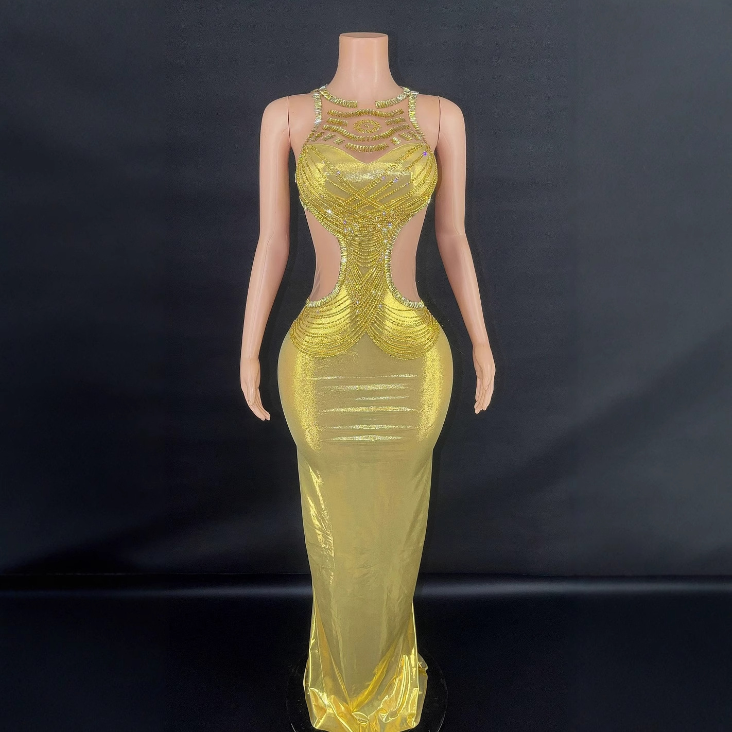 欧米の新型ファッションアマゾンのセクシーなタイトなネットの透視気質はお尻の金色の舞台を包んで出演服を司会します。