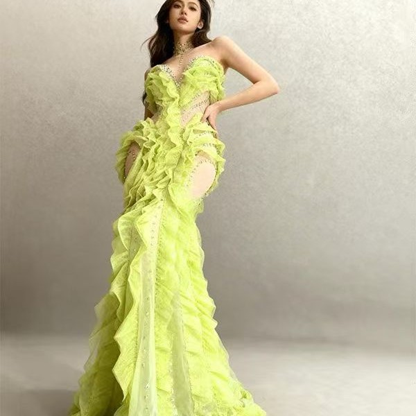 新款原创仙气飘飘波浪网纱鱼尾长裙环球小姐大赛走秀主持领奖礼服