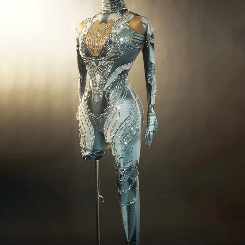 アマゾンの人気公演服「ゴーゴー」のダンス服のダイヤモンドのバンドのセクシーな演技服の機械科学技術の未来感