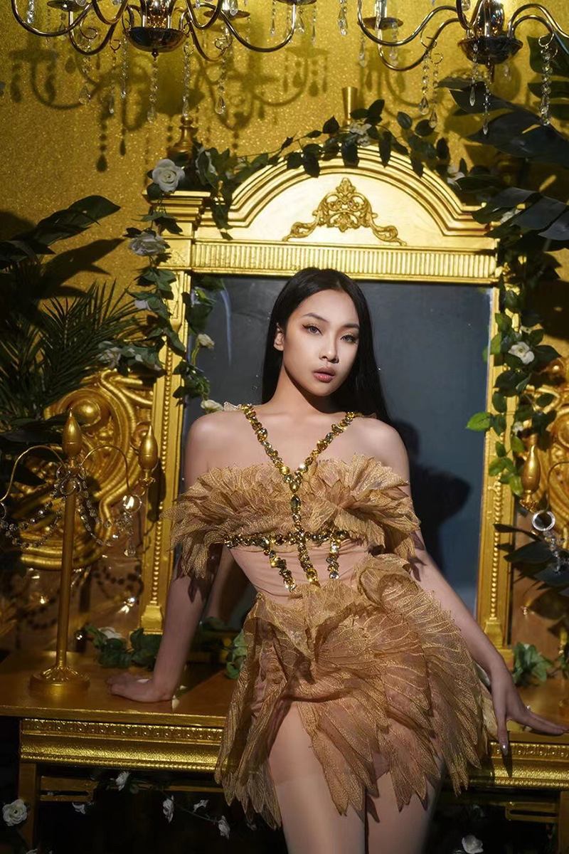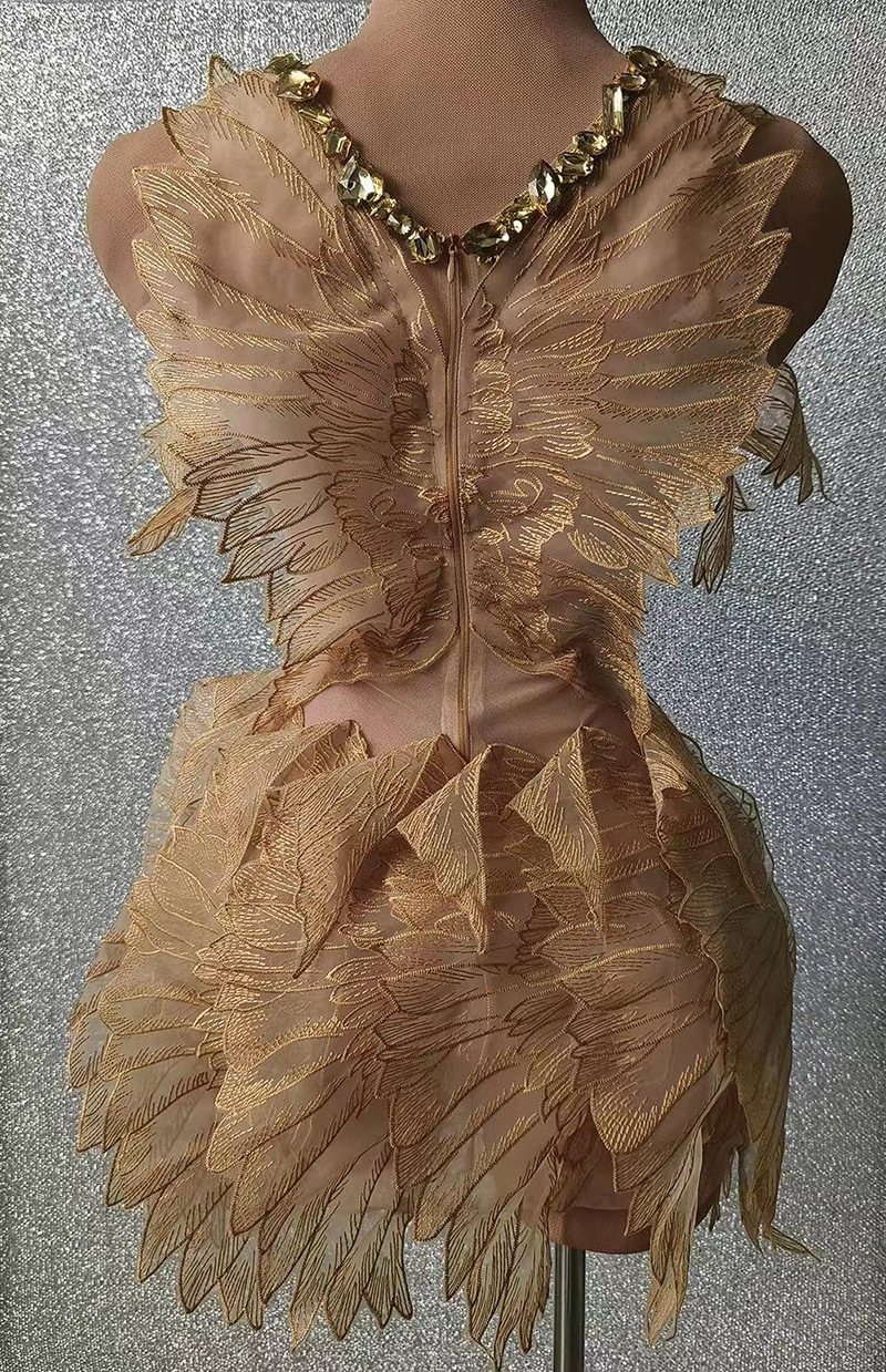 GC香槟金闪钻挂脖无袖翅膀叶片设计温柔高雅短款晚礼裙金色白色