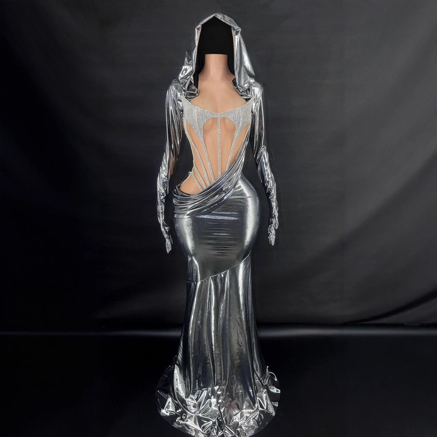 GC誕生日ロングスカートキラキラ光るドリル銀色のワンピースの大きいサイズの女性のパーティーのドレスの掛け首式の魚の尾のロングスカートはありません。