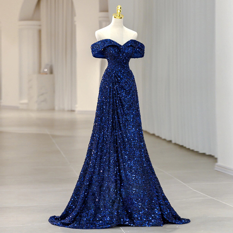 一字の肩の大きいサイズのタキシードの青いスパンコールの新婦の敬酒服の宴会の司会者の太っているmmの気質の芸考のドレス