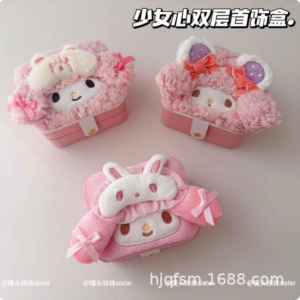 可爱卡通美乐蒂小羊毛绒便携式旅行双层首饰盒耳环耳钉项链收纳盒