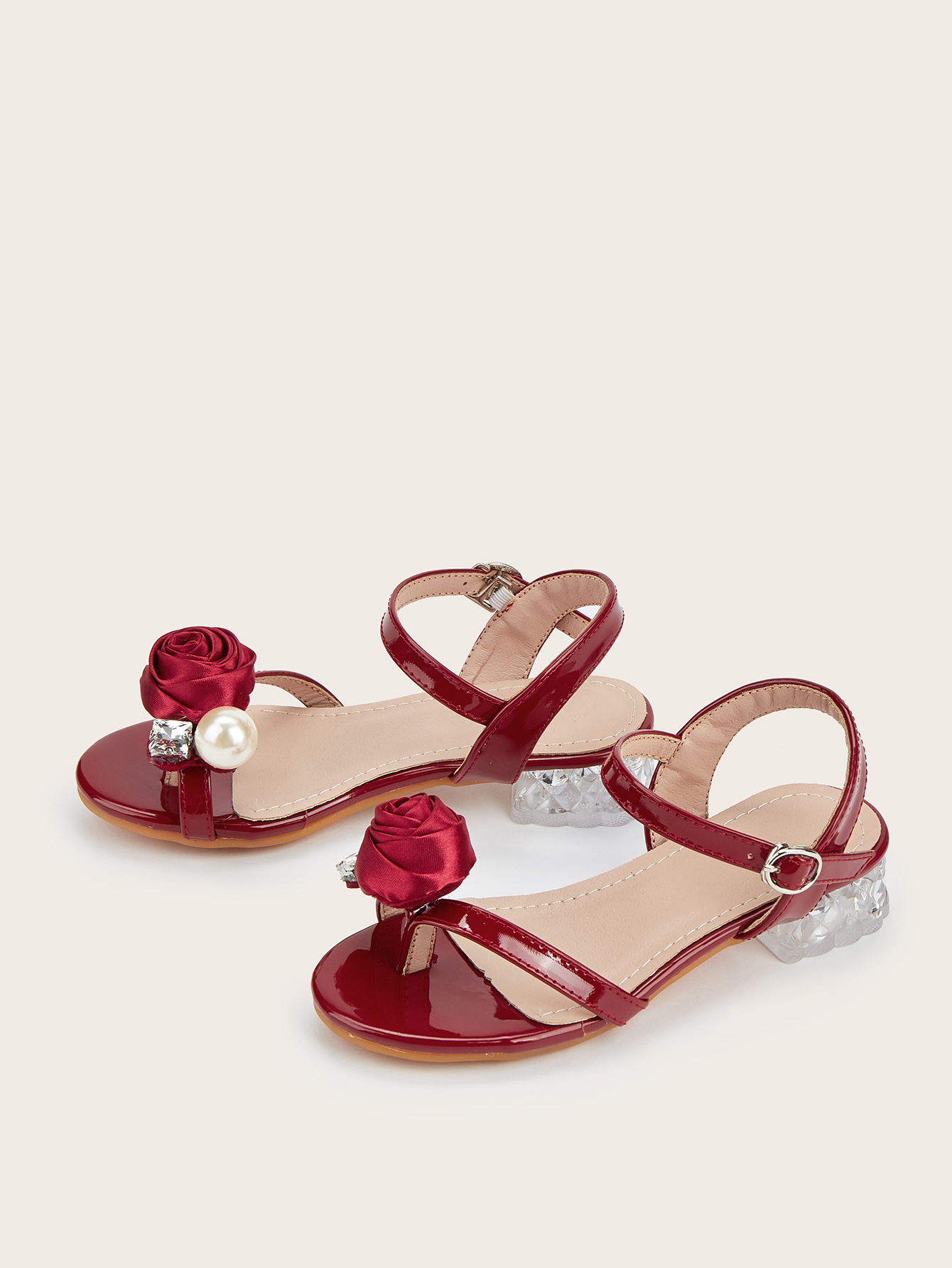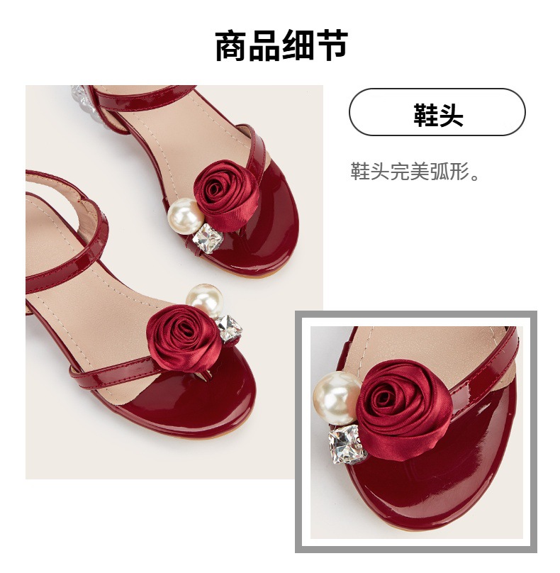 新しい子供のハイヒールの太さと水晶と丸い頭の後の空の赤い花の少女のファッション