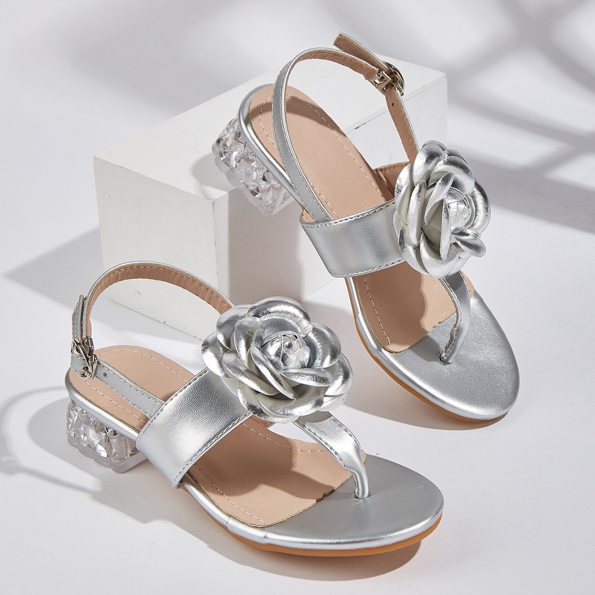 2026年新作 子供用ハイヒール 太ヒール クリスタルヒール ラウンドトゥ バックオープン シルバー ピンク 椿の花柄 女の子向けファッション