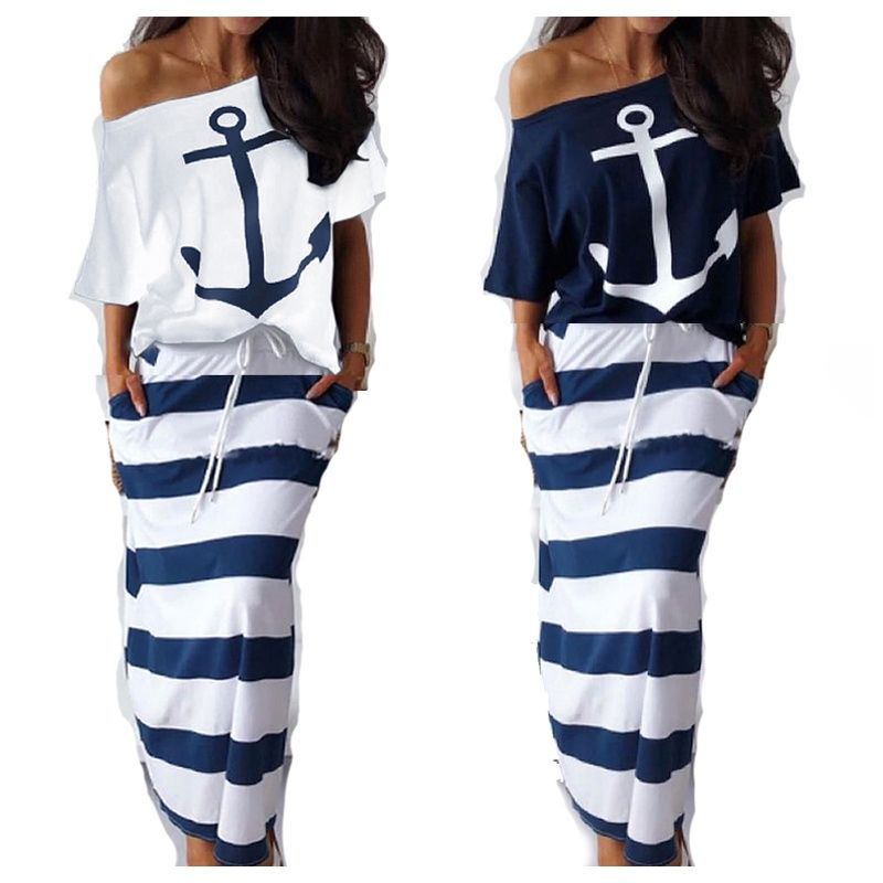 クロスボーダー AliExpress Amazon eBay ネイビーカジュアルアンカープリント Tシャツ + スカートセット
