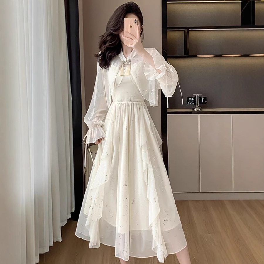 新しい中国風のスーツスカート女性のための 2025 春と夏の新しいスタイルのカーディガンフリルサスペンダードレス 2 点セット