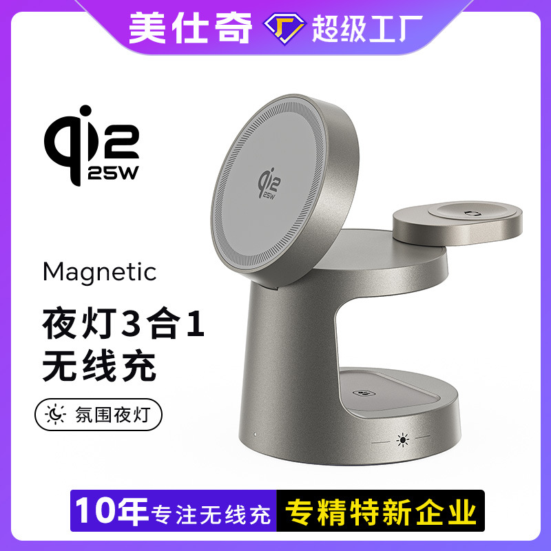 跨境爆款25W快充带夜灯磁吸床头无线充 手机支架三合一无线充电器