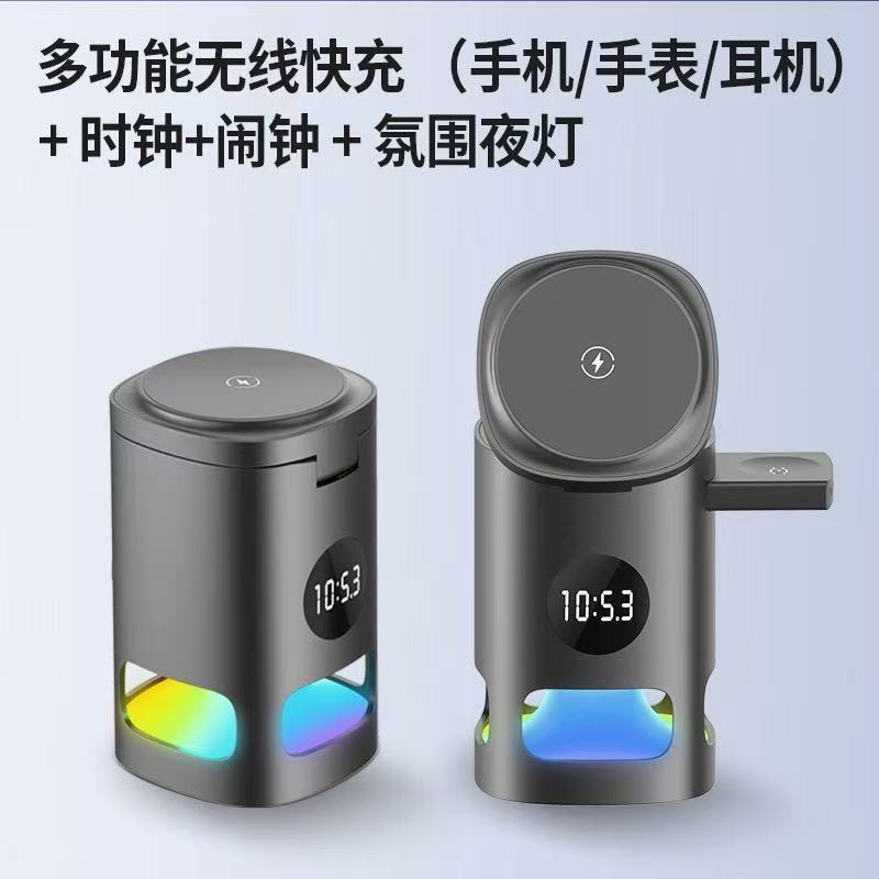 2025年跨境新款桌面三合一磁吸无线充带时钟闹钟氛围灯功能无线充