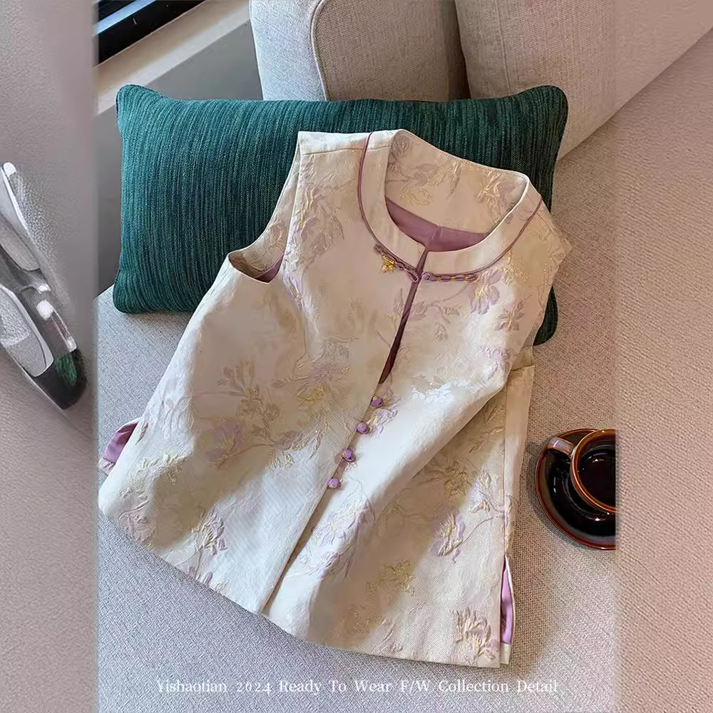 新中国風ジャカード盤ボタン丸襟馬甲2024女春夏高級感改良唐装袖なしベスト