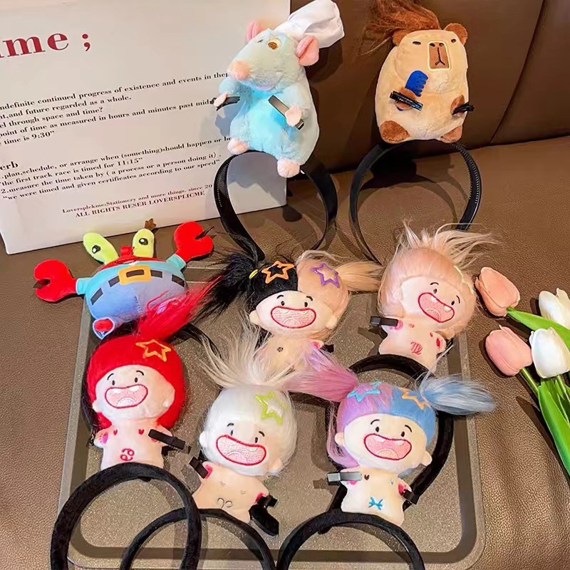 料理鼠王の漫画人形のカチューシャの女性はぬいぐるみをからかって前髪をつかんで、面白い髪飾りをします。