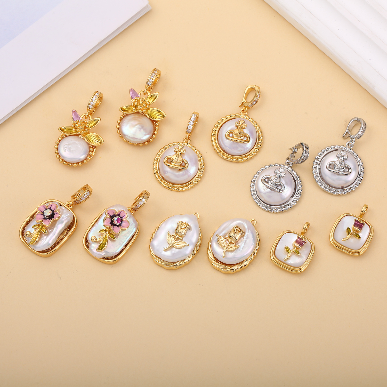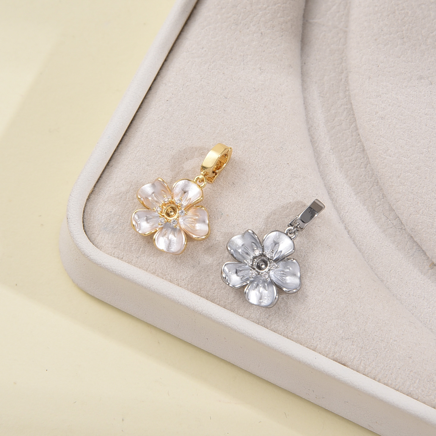 山茶花淡水珍珠空托油画风吊坠挂件diy手链项链饰品配件铜镀18k金