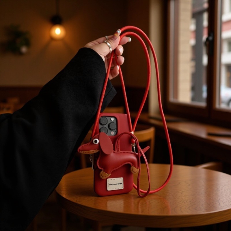 ins皮质腊肠狗斜挎背夹可爱相机挂绳卡通手机壳背夹防丢通用背包