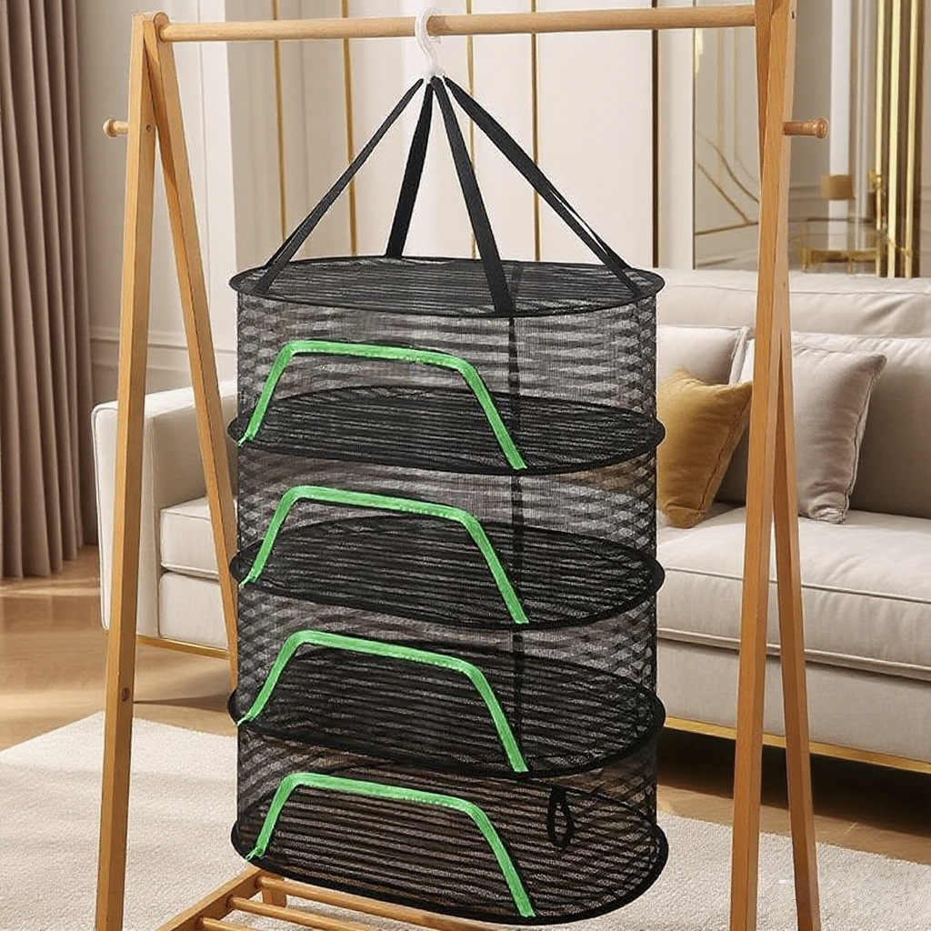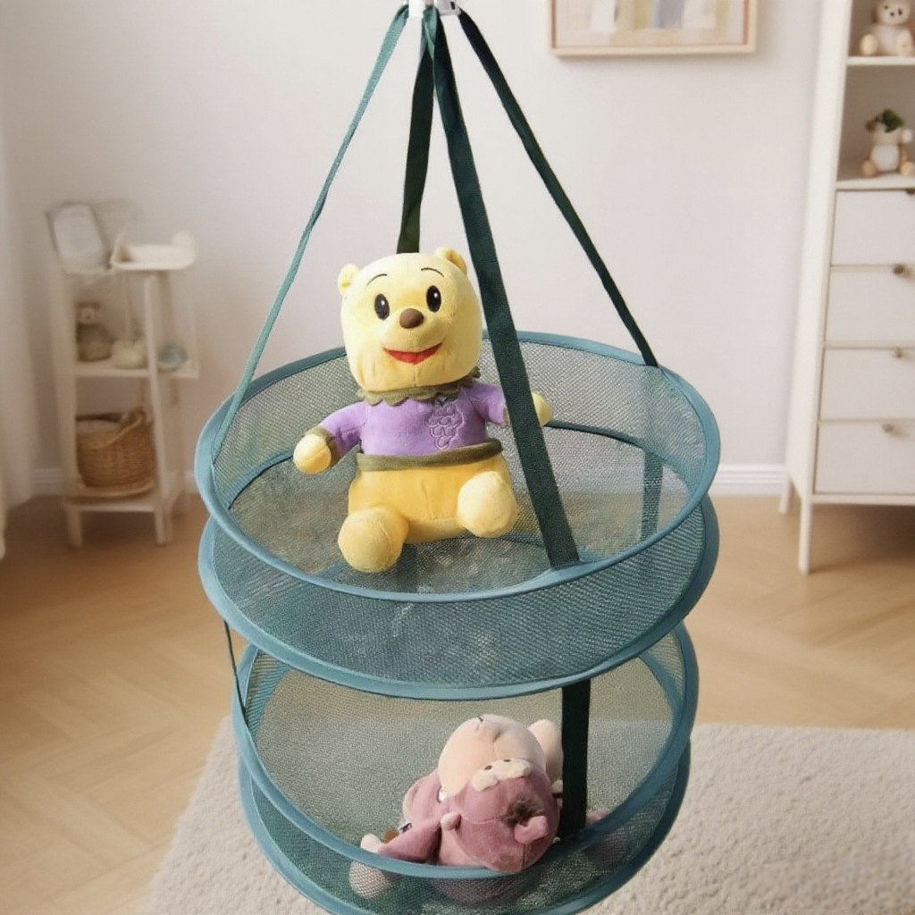 【直送】墨緑色の大型厚手長方形物干しかご、強化物干しネットポケット収納、二層設計