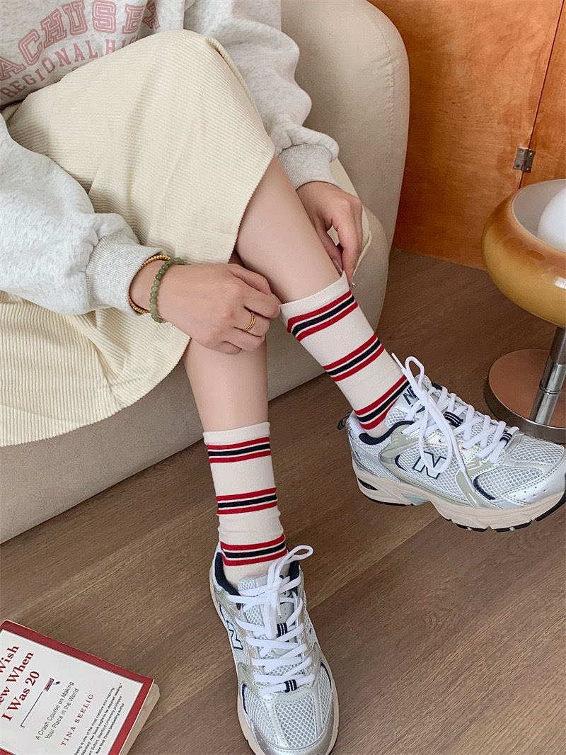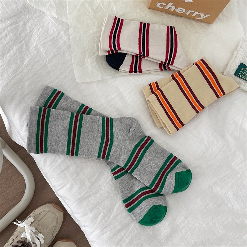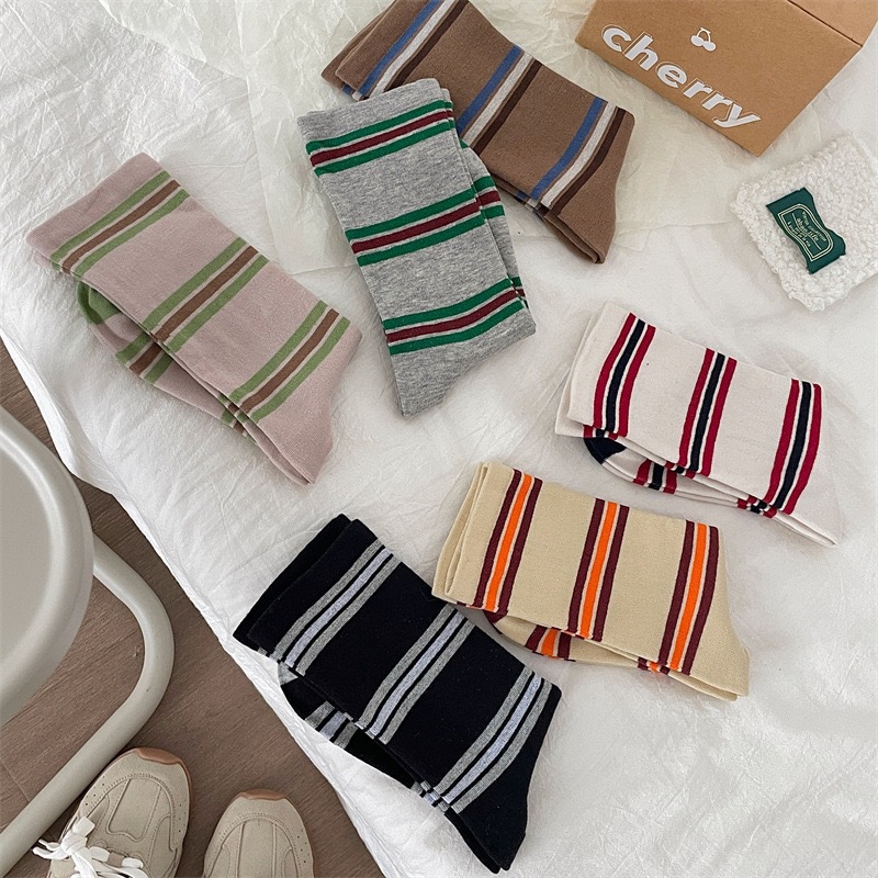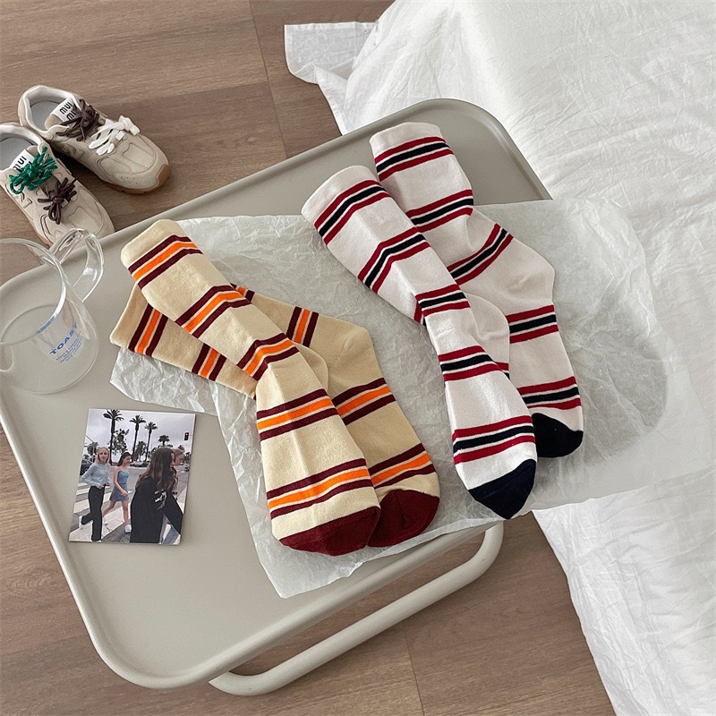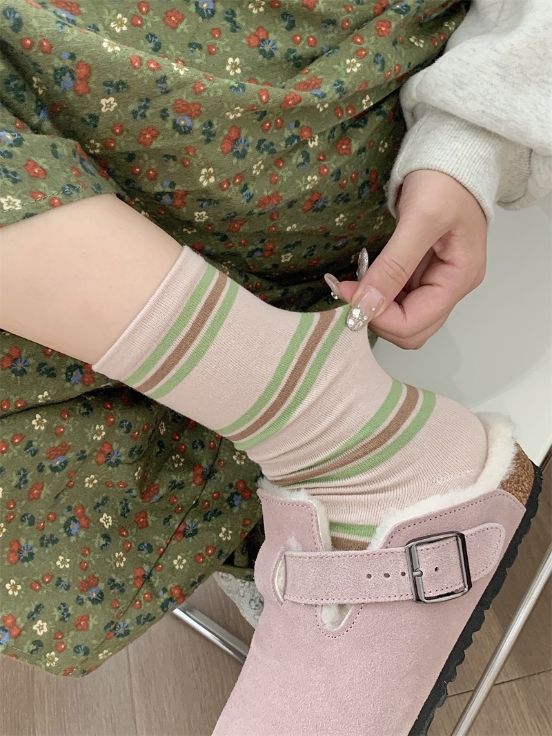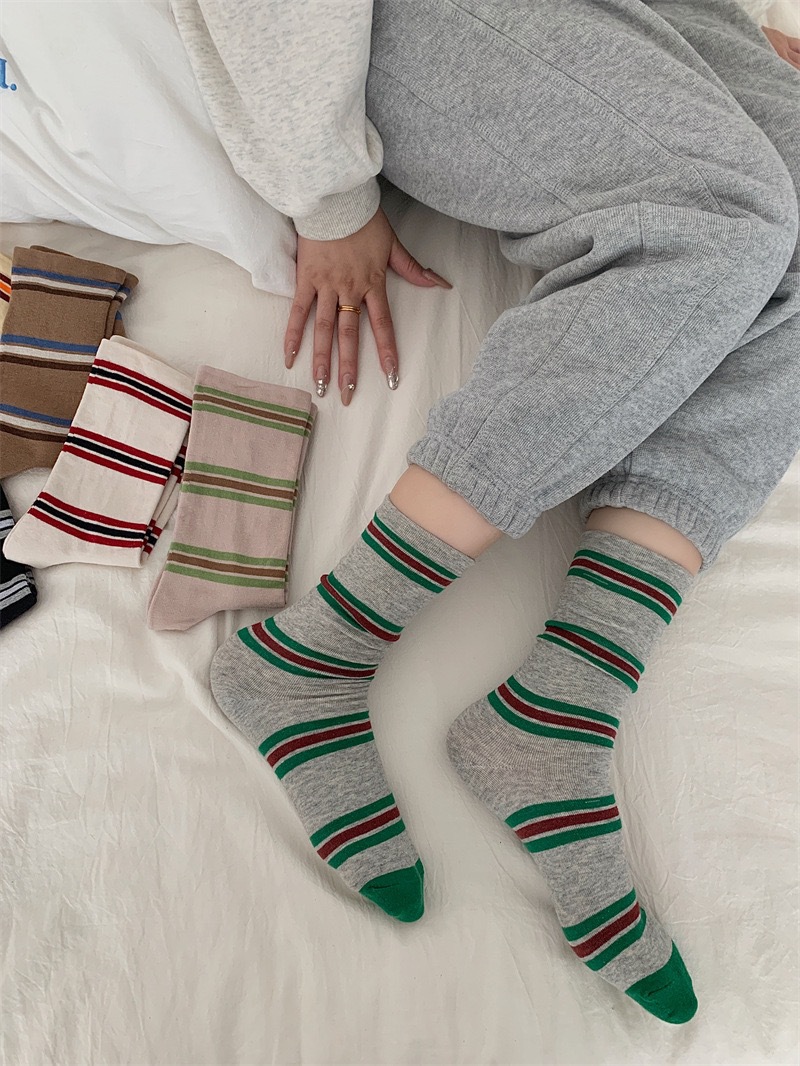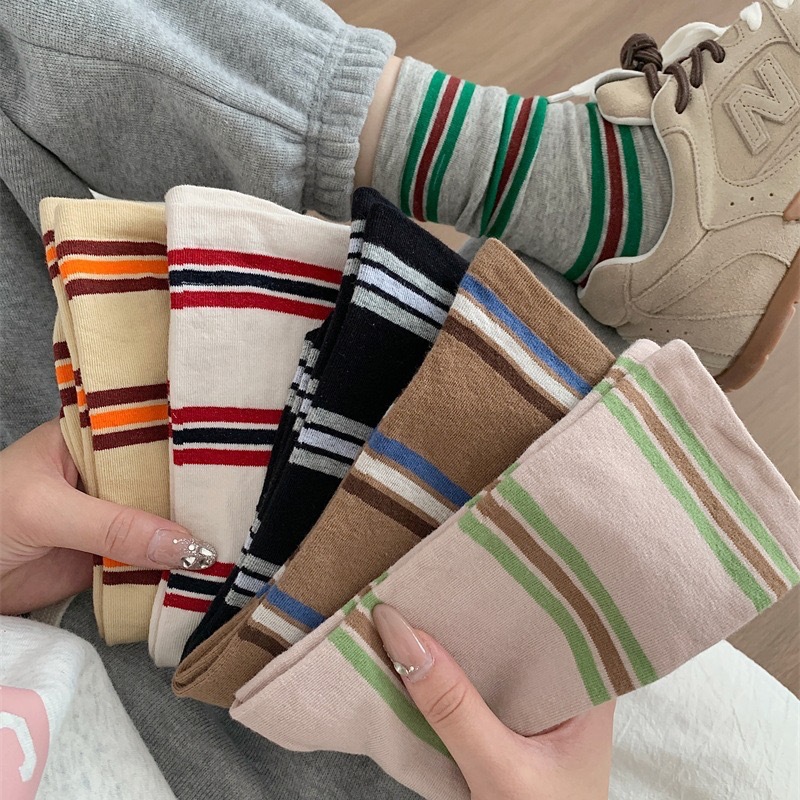 小众韩国东大门拼色条纹中筒袜子女舒适百搭休闲个性纯棉袜堆堆袜
