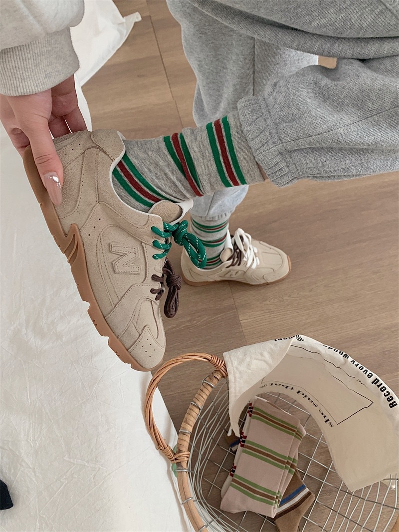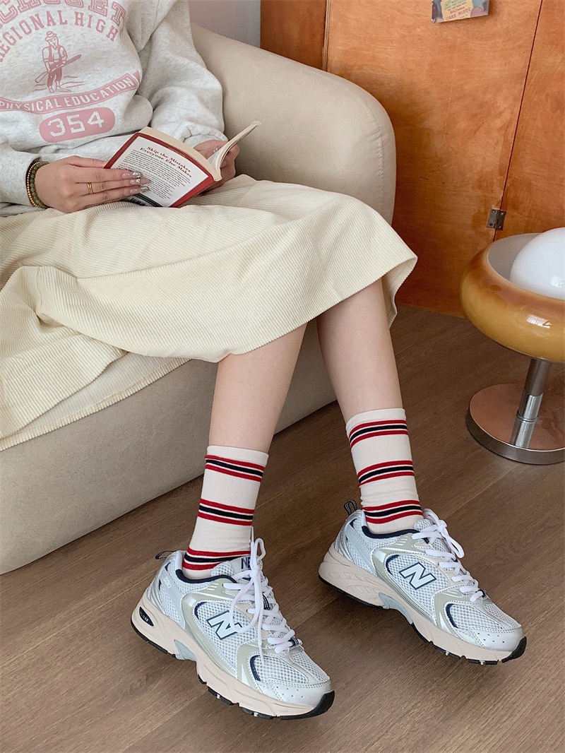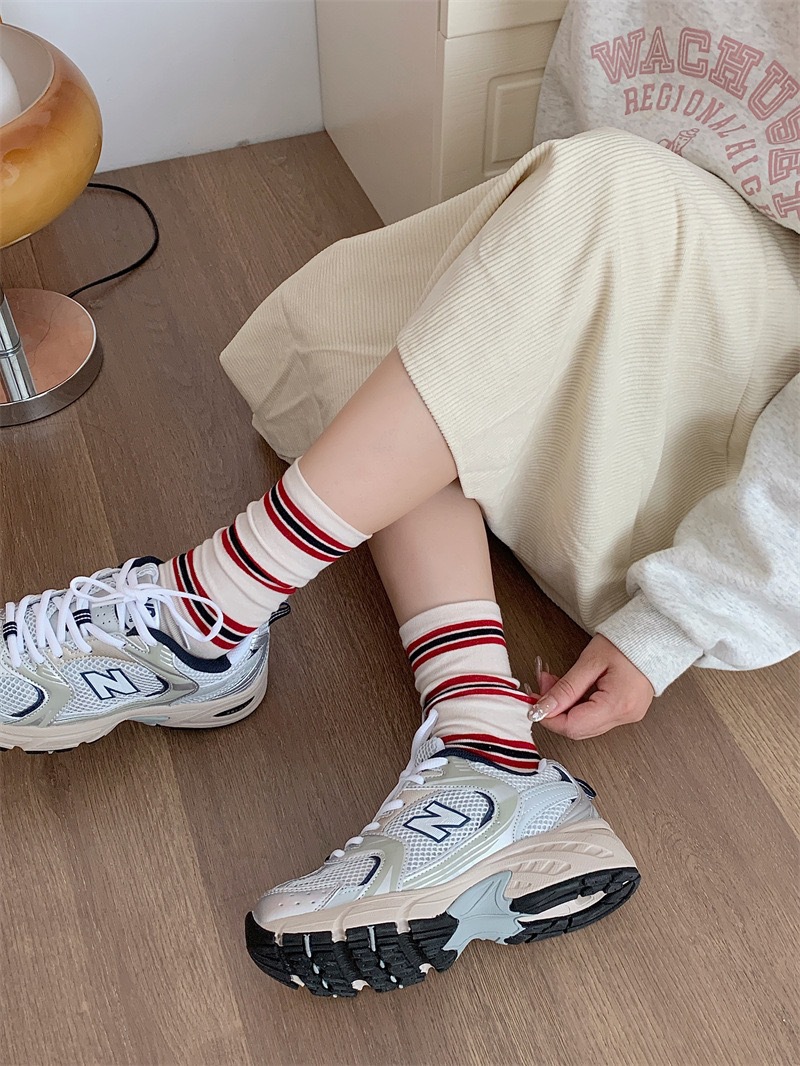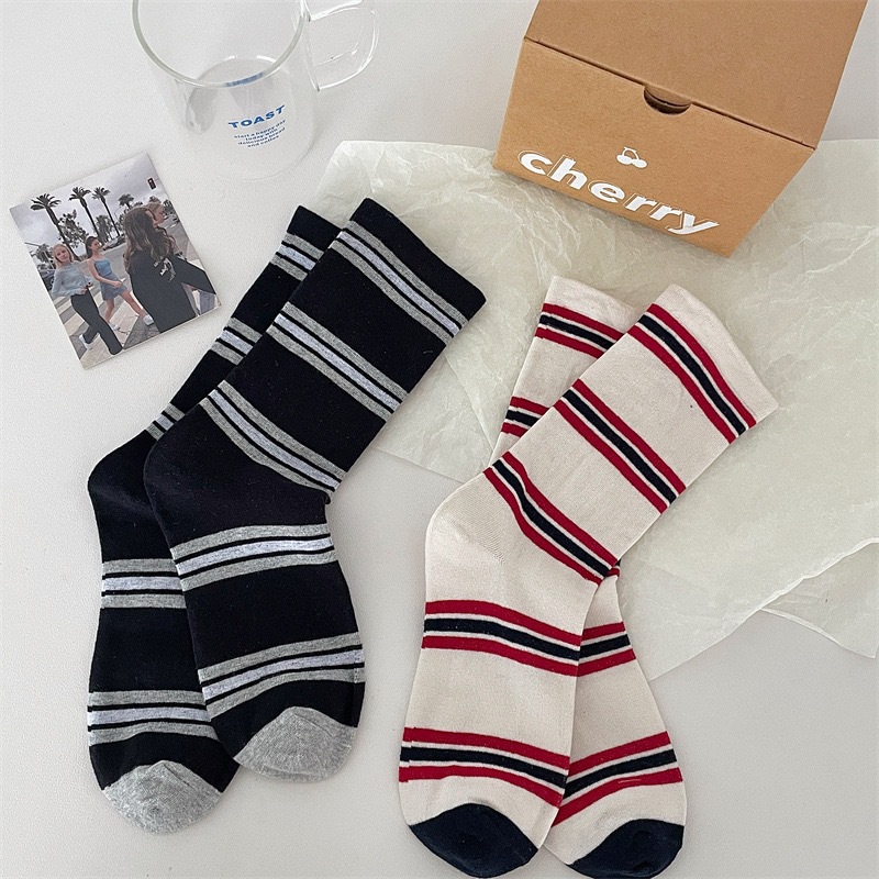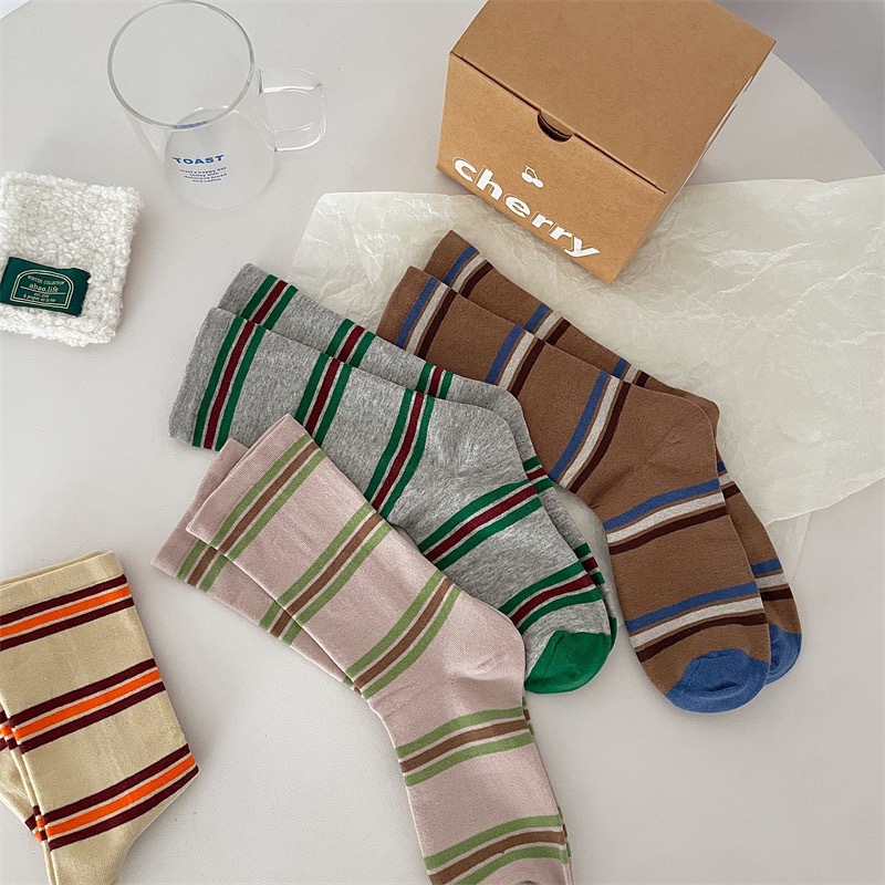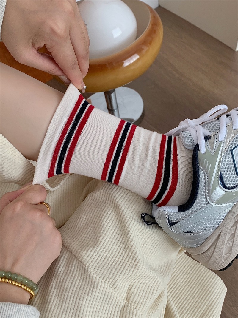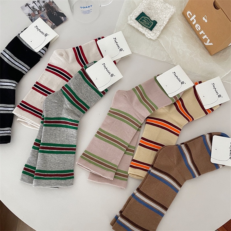 小众韩国东大门拼色条纹中筒袜子女舒适百搭休闲个性纯棉袜堆堆袜