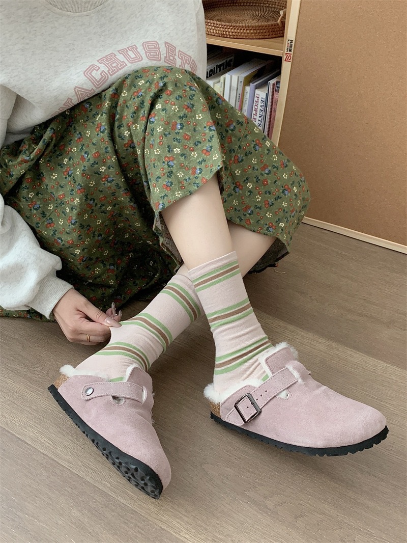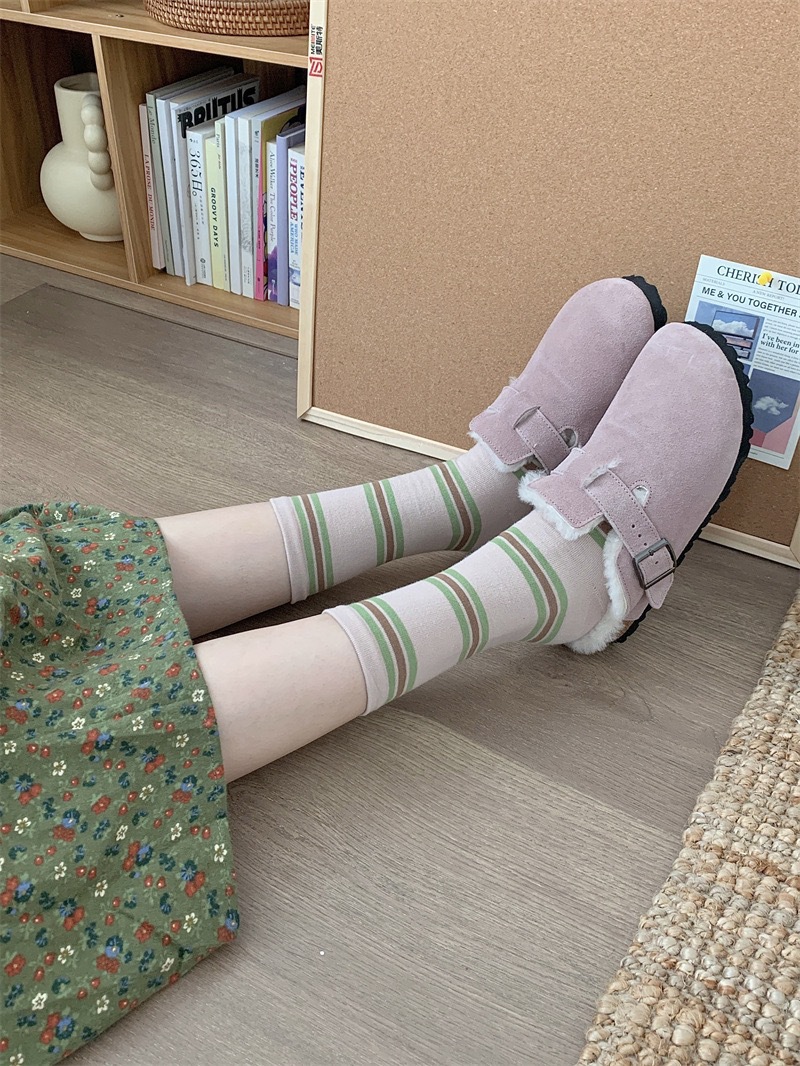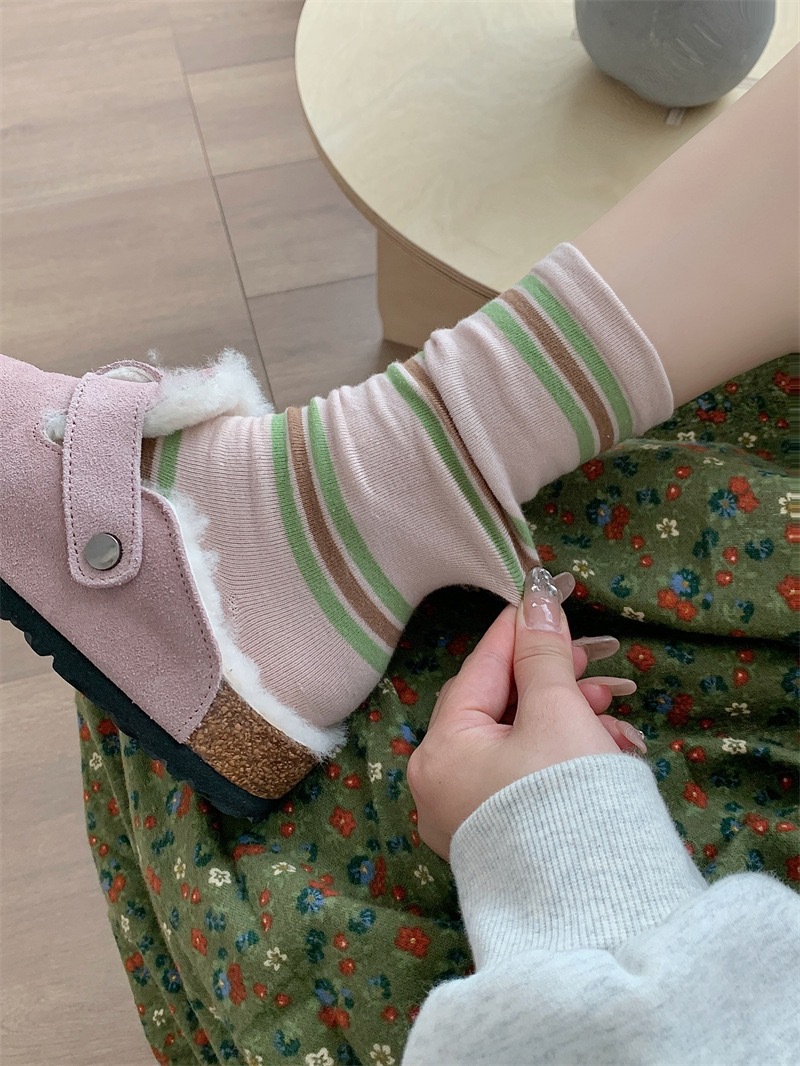 女性用ソックス、春と秋のパイルソックス、イントレンディな日本製縦縞無地ミッドチューブパイルソックス、通気性と吸汗性のある綿のソックス