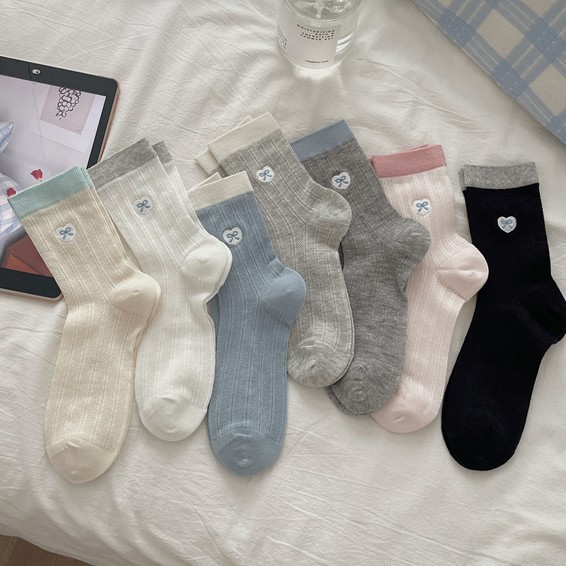 新しい愛の刺繍春と夏の薄い靴下女性のミッドチューブ綿の靴下イントレンディな韓国スタイルのリボンパイルソックスロングソックス